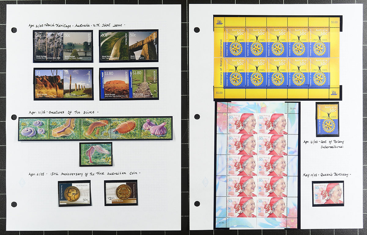 Comprehensive VF mint Never Hinged 2004-2007 collection of 284 mint stamps including miniature panes and strips plus some used material. Total usable face value as postage is AUD$234.15 = $210.50 CDN. Owner's older 2014 Scott US$640.25 =
