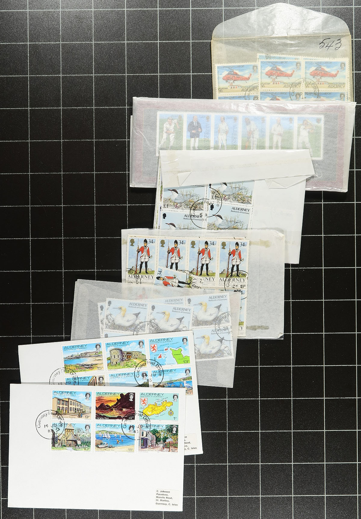Exceptionally clean, comprehensive balanced CDS used (CTO) dealers stock of the scarce early sets, souvenir sheets, booklets and singles from this popular "late addition" Channel Island stamp issuing entity. While there are between one and fifty examples of any given set, souvenir sheet, booklet or single, the majority are here in quantities of ten of each. Many of the sets are in blocks. A most unusual and useful offering, perfect for the show dealer or investor. We have never seen this much used Alderney in one lot before. See the scans for the neatly hand-written two page inventory list. Owner's older 2013 Scott US$4,810.30 =