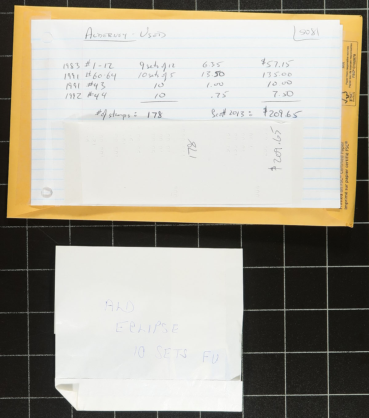 Exceptionally clean, comprehensive balanced CDS used (CTO) dealers stock of the scarce early sets, souvenir sheets, booklets and singles from this popular "late addition" Channel Island stamp issuing entity. While there are between one and fifty examples of any given set, souvenir sheet, booklet or single, the majority are here in quantities of ten of each. Many of the sets are in blocks. A most unusual and useful offering, perfect for the show dealer or investor. We have never seen this much used Alderney in one lot before. See the scans for the neatly hand-written two page inventory list. Owner's older 2013 Scott US$4,810.30 =