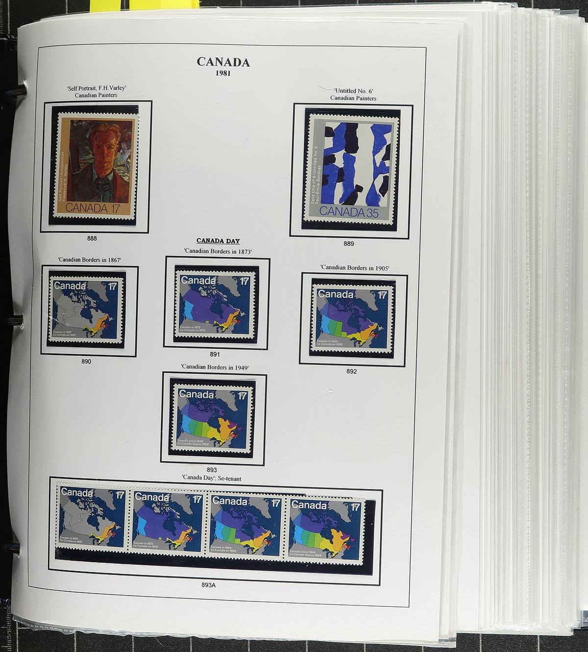 The "immaculate" mint collection, Part #2. VF mint Never Hinged run of years 1981-1993 (#888-1498) all neatly arranged in mounts, on computer generated pages, with all pages being in page-protectors within a 3" binder. Seemingly complete for the period for single stamps, but also includes showings of souvenir sheets, plate blocks, booklet panes, complete booklets, blocks etc. Meticulously arranged and maintained. Conservatively valued for the total face value only. Pictures show a representative sample. Total face value =