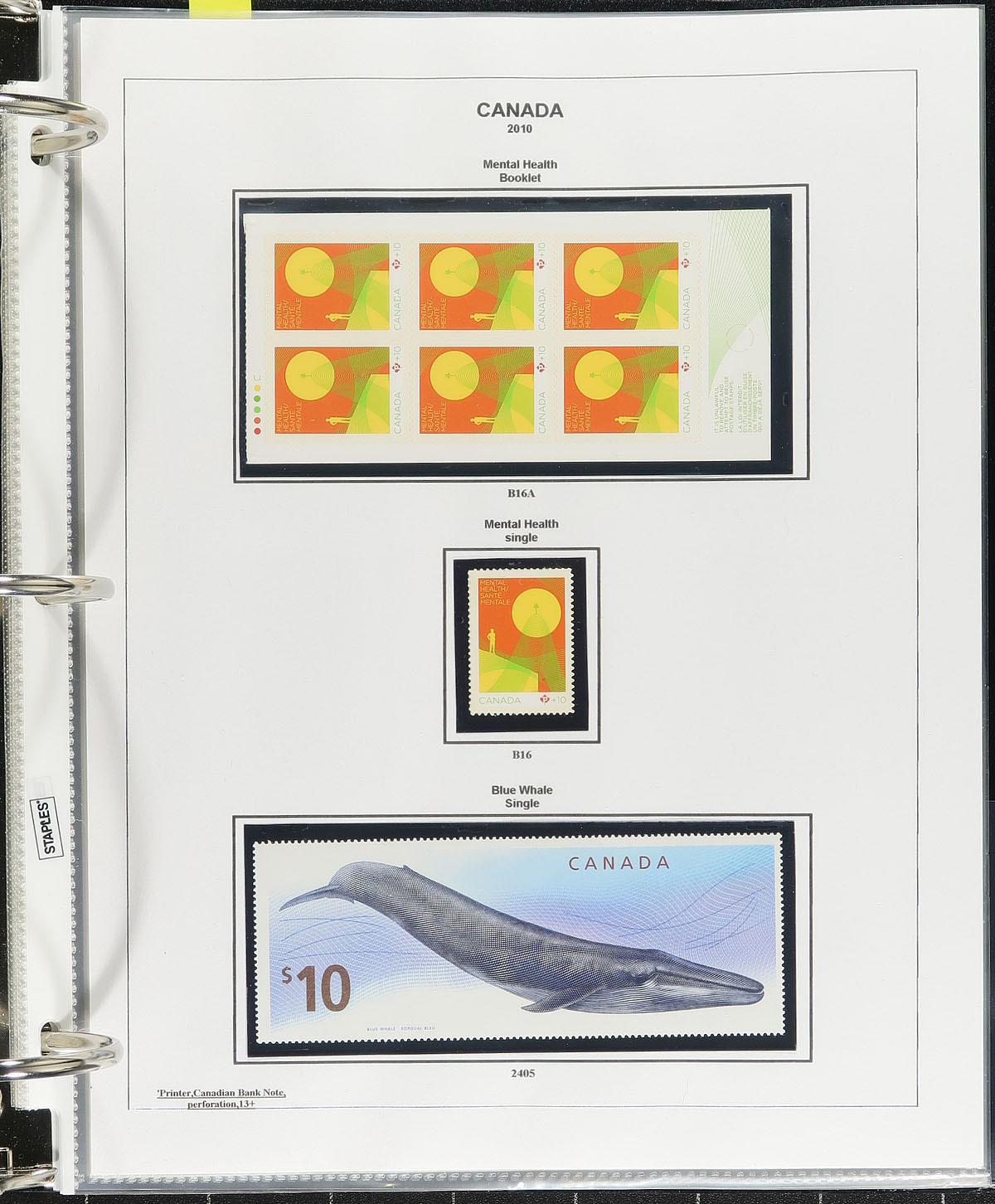 The "immaculate" mint collection, Part #6. VF mint Never Hinged run of years 2008-2010 (#2257-2415) all neatly arranged in mounts, on computer generated pages, with all pages being in page-protectors within a 3" binder. Almost complete for the period for single stamps, but also includes showings of souvenir sheets, blocks, booklet singles, booklet panes etc. Of particular note, is the transition to "P" stamps during this period, with the majority of the later lettermail rates be represented by "P" stamps. Meticulously arranged and maintained. Conservatively valued for the total face value only. Pictures show a representative sample. Total face value =