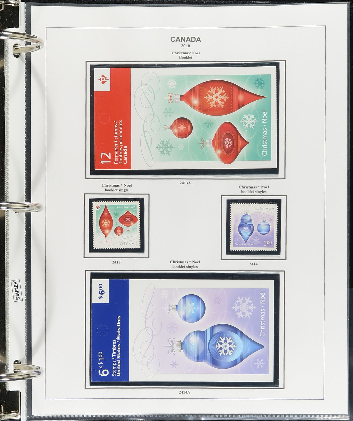 The "immaculate" mint collection, Part #6. VF mint Never Hinged run of years 2008-2010 (#2257-2415) all neatly arranged in mounts, on computer generated pages, with all pages being in page-protectors within a 3" binder. Almost complete for the period for single stamps, but also includes showings of souvenir sheets, blocks, booklet singles, booklet panes etc. Of particular note, is the transition to "P" stamps during this period, with the majority of the later lettermail rates be represented by "P" stamps. Meticulously arranged and maintained. Conservatively valued for the total face value only. Pictures show a representative sample. Total face value =
