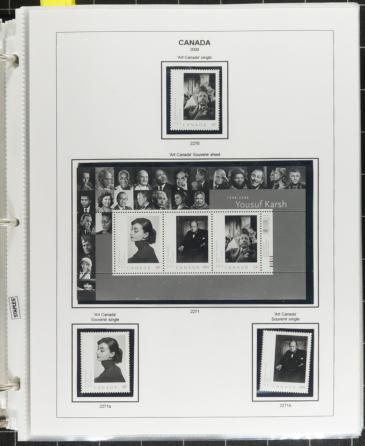 The "immaculate" mint collection, Part #6. VF mint Never Hinged run of years 2008-2010 (#2257-2415) all neatly arranged in mounts, on computer generated pages, with all pages being in page-protectors within a 3" binder. Almost complete for the period for single stamps, but also includes showings of souvenir sheets, blocks, booklet singles, booklet panes etc. Of particular note, is the transition to "P" stamps during this period, with the majority of the later lettermail rates be represented by "P" stamps. Meticulously arranged and maintained. Conservatively valued for the total face value only. Pictures show a representative sample. Total face value =