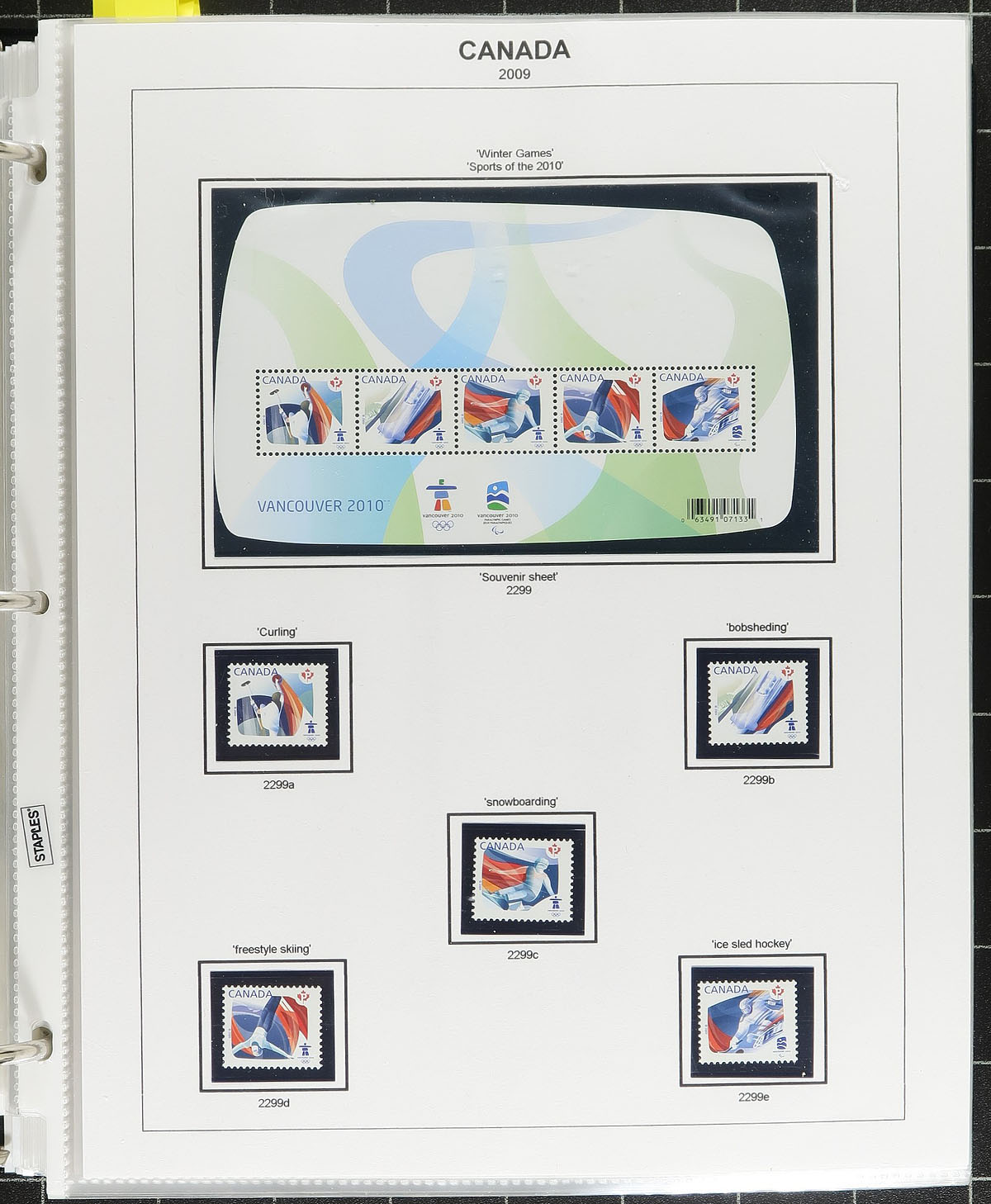 The "immaculate" mint collection, Part #6. VF mint Never Hinged run of years 2008-2010 (#2257-2415) all neatly arranged in mounts, on computer generated pages, with all pages being in page-protectors within a 3" binder. Almost complete for the period for single stamps, but also includes showings of souvenir sheets, blocks, booklet singles, booklet panes etc. Of particular note, is the transition to "P" stamps during this period, with the majority of the later lettermail rates be represented by "P" stamps. Meticulously arranged and maintained. Conservatively valued for the total face value only. Pictures show a representative sample. Total face value =