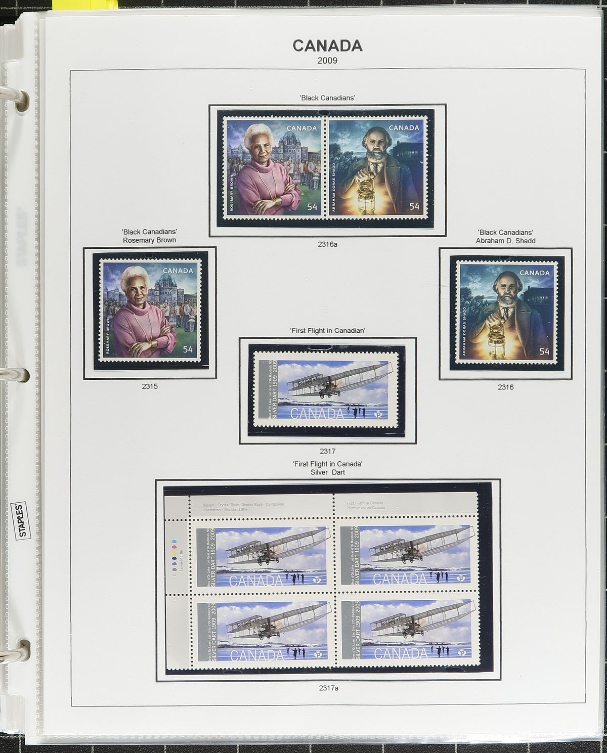 The "immaculate" mint collection, Part #6. VF mint Never Hinged run of years 2008-2010 (#2257-2415) all neatly arranged in mounts, on computer generated pages, with all pages being in page-protectors within a 3" binder. Almost complete for the period for single stamps, but also includes showings of souvenir sheets, blocks, booklet singles, booklet panes etc. Of particular note, is the transition to "P" stamps during this period, with the majority of the later lettermail rates be represented by "P" stamps. Meticulously arranged and maintained. Conservatively valued for the total face value only. Pictures show a representative sample. Total face value =