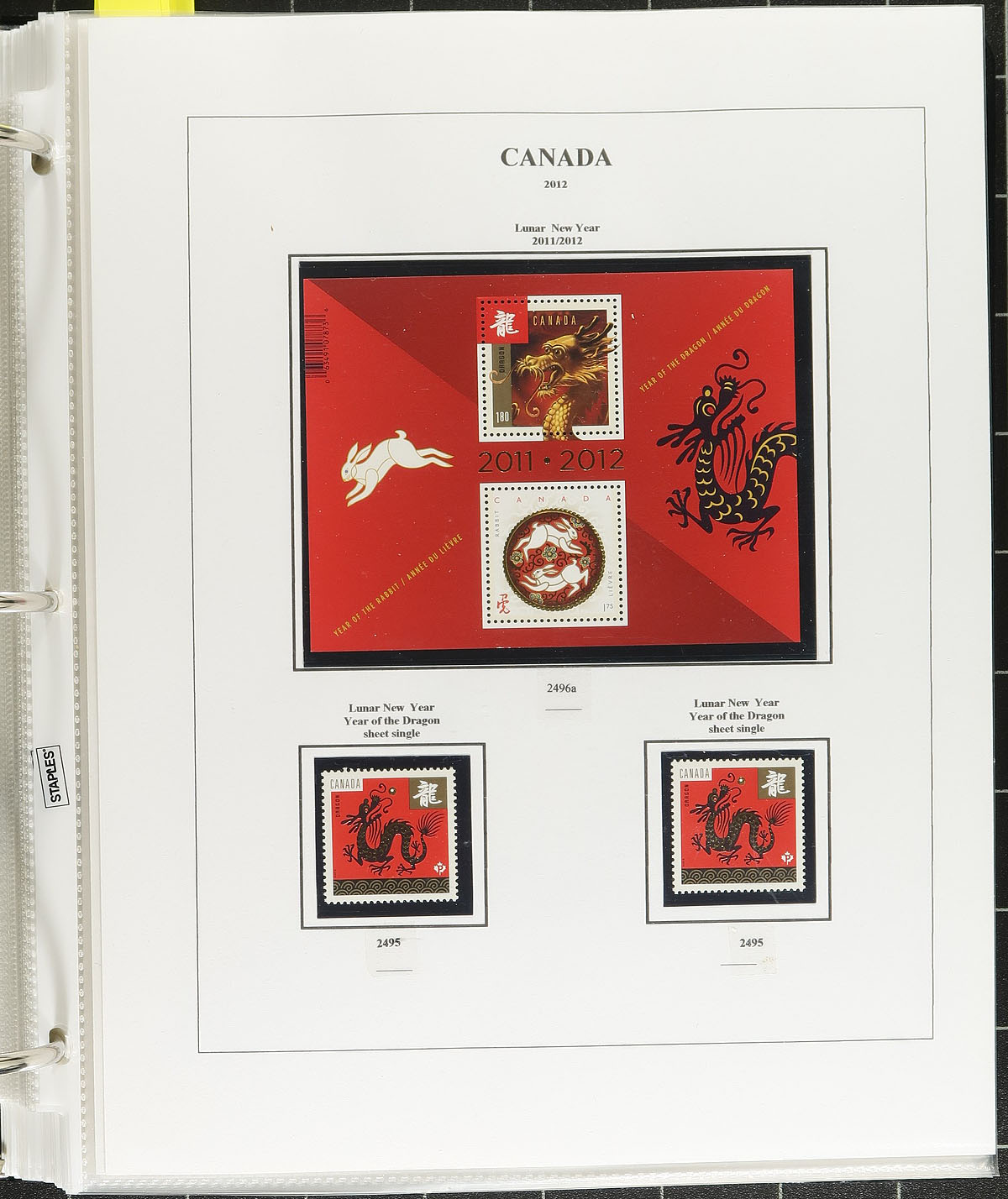 The "immaculate" mint collection, Part #7. VF mint Never Hinged run of years 2011-2012 (#2416-2598) all neatly arranged in mounts, on computer generated pages, with all pages being in page-protectors within a 3" binder. Near complete for the period for single stamps, but also includes showings of souvenir sheets, blocks, booklet singles, booklet panes etc. Of particular note, is the abundance of "P" stamps and "dollar plus" values. Meticulously arranged and maintained. Conservatively valued for the total face value only. Pictures show a representative sample. Total face value =