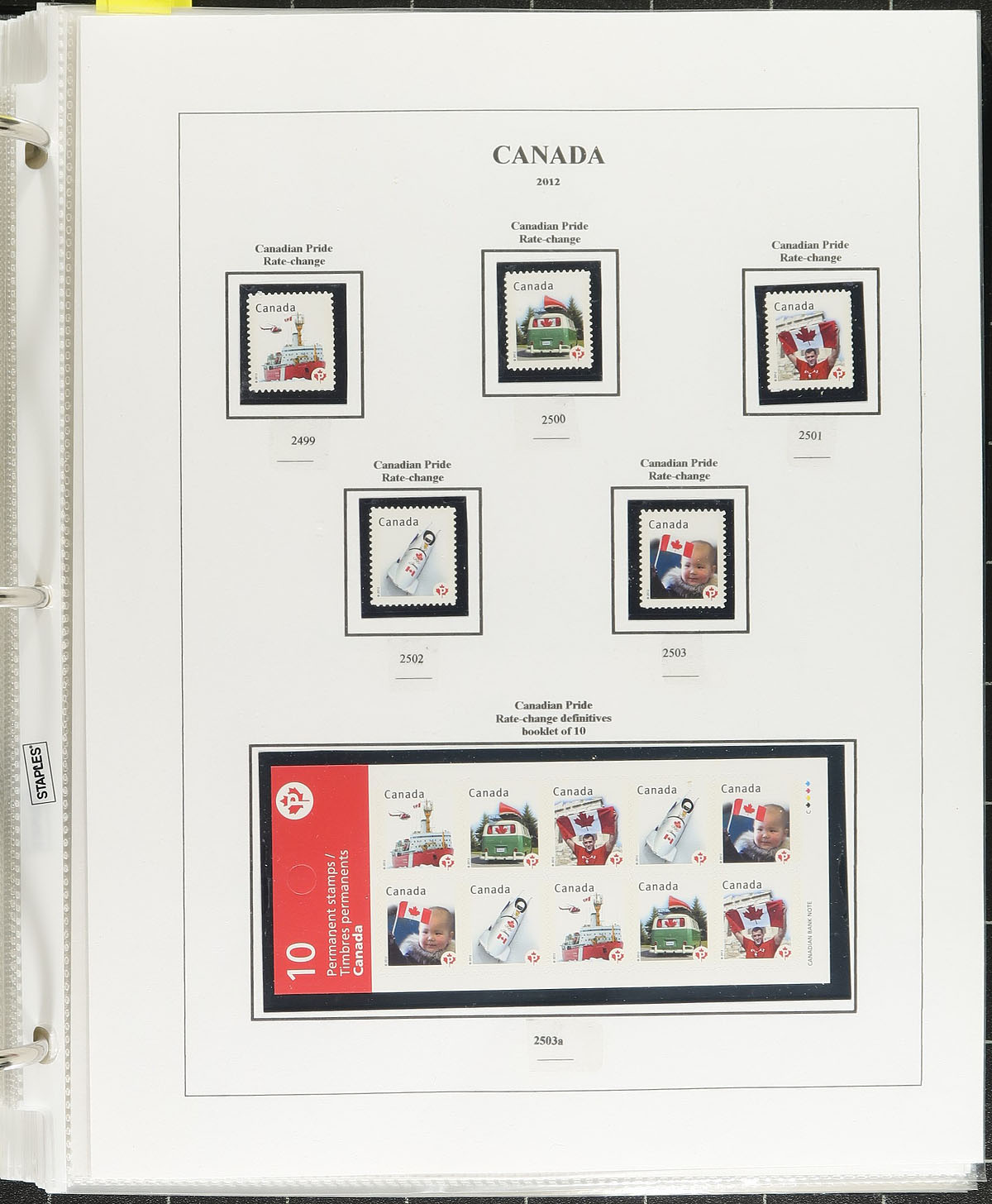 The "immaculate" mint collection, Part #7. VF mint Never Hinged run of years 2011-2012 (#2416-2598) all neatly arranged in mounts, on computer generated pages, with all pages being in page-protectors within a 3" binder. Near complete for the period for single stamps, but also includes showings of souvenir sheets, blocks, booklet singles, booklet panes etc. Of particular note, is the abundance of "P" stamps and "dollar plus" values. Meticulously arranged and maintained. Conservatively valued for the total face value only. Pictures show a representative sample. Total face value =