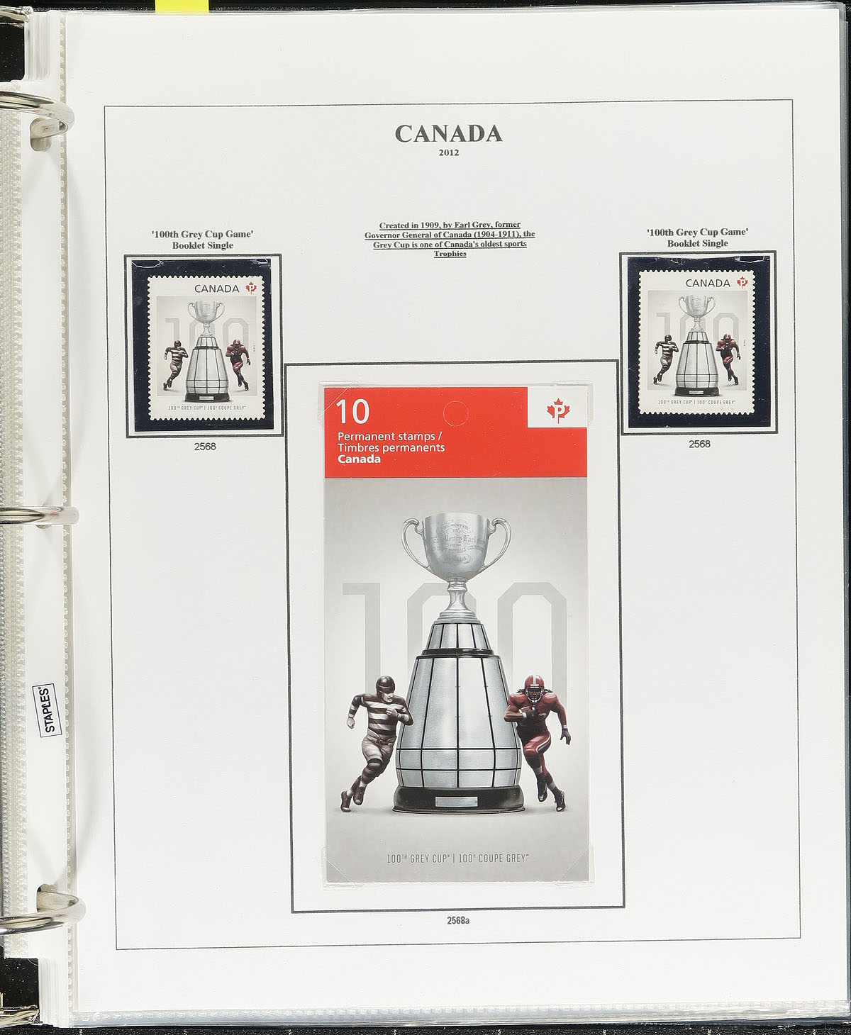 The "immaculate" mint collection, Part #7. VF mint Never Hinged run of years 2011-2012 (#2416-2598) all neatly arranged in mounts, on computer generated pages, with all pages being in page-protectors within a 3" binder. Near complete for the period for single stamps, but also includes showings of souvenir sheets, blocks, booklet singles, booklet panes etc. Of particular note, is the abundance of "P" stamps and "dollar plus" values. Meticulously arranged and maintained. Conservatively valued for the total face value only. Pictures show a representative sample. Total face value =
