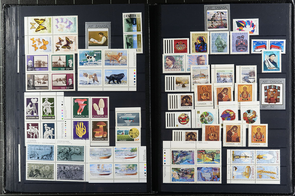 Deluxe padded 32-page Lighthouse brand stockbook, with slipcase containing an array of (mostly) mint Never Hinged Canada. An eclectic array of material here, starting with a showing of QV / QEII Jubilee issues ) the 1897 1c block is Hinged, rest never hinged. The album then transitions to 1930's to 1990's mint Canada, including Newfoundland and "back of the book" issues. A couple notable items are #604a (8c QEII imperforate pair, NH, slight bend at right, catalogue $200.00), George VI Coils, Plate Blocks, sets, Special Delivery Airmail blocks etc. A high-quality offering. Face value of the "modern" stamps alone is $200.00! Estimate =