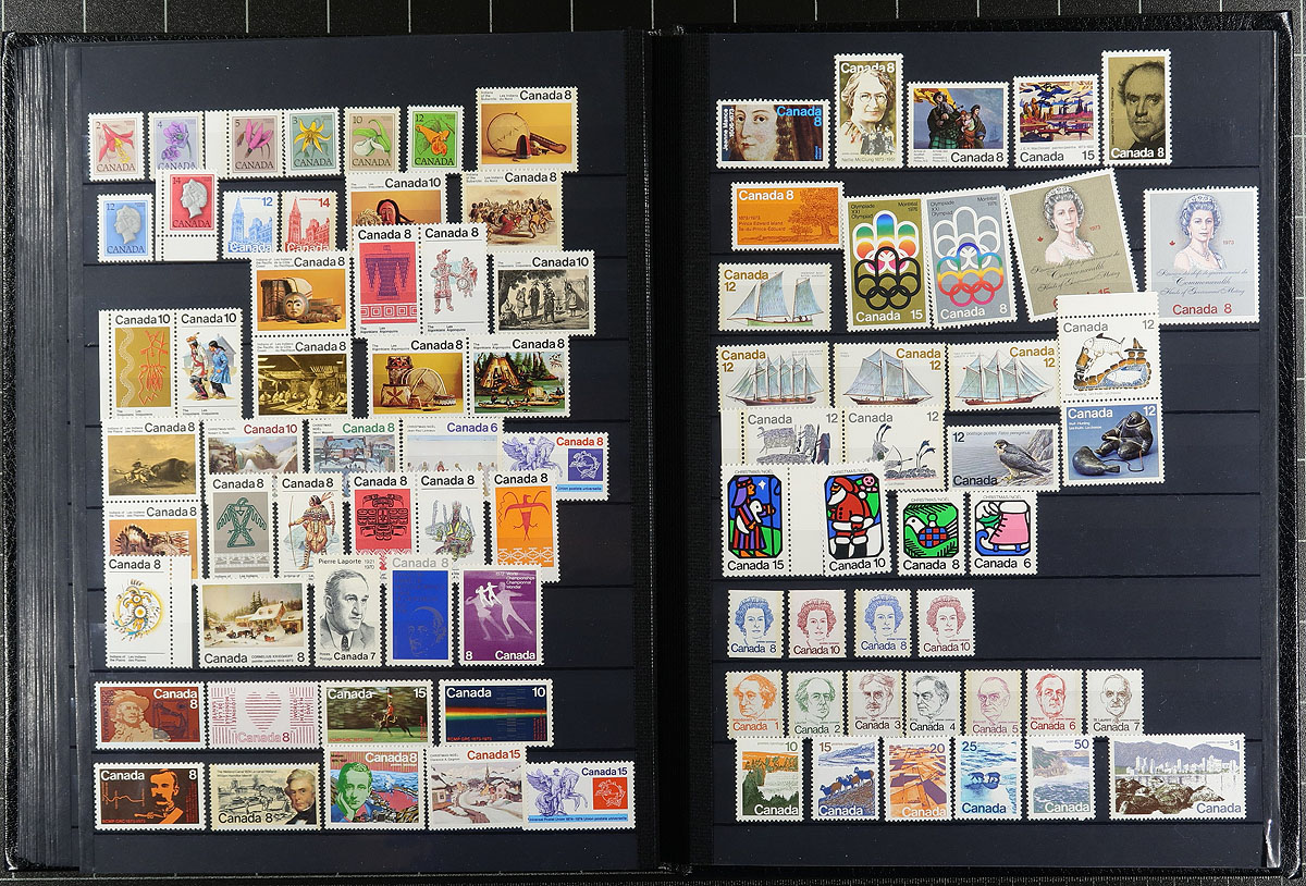 Deluxe padded 32-page Lighthouse brand stockbook, with slipcase containing an array of (mostly) mint Never Hinged Canada. An eclectic array of material here, starting with a showing of QV / QEII Jubilee issues ) the 1897 1c block is Hinged, rest never hinged. The album then transitions to 1930's to 1990's mint Canada, including Newfoundland and "back of the book" issues. A couple notable items are #604a (8c QEII imperforate pair, NH, slight bend at right, catalogue $200.00), George VI Coils, Plate Blocks, sets, Special Delivery Airmail blocks etc. A high-quality offering. Face value of the "modern" stamps alone is $200.00! Estimate =