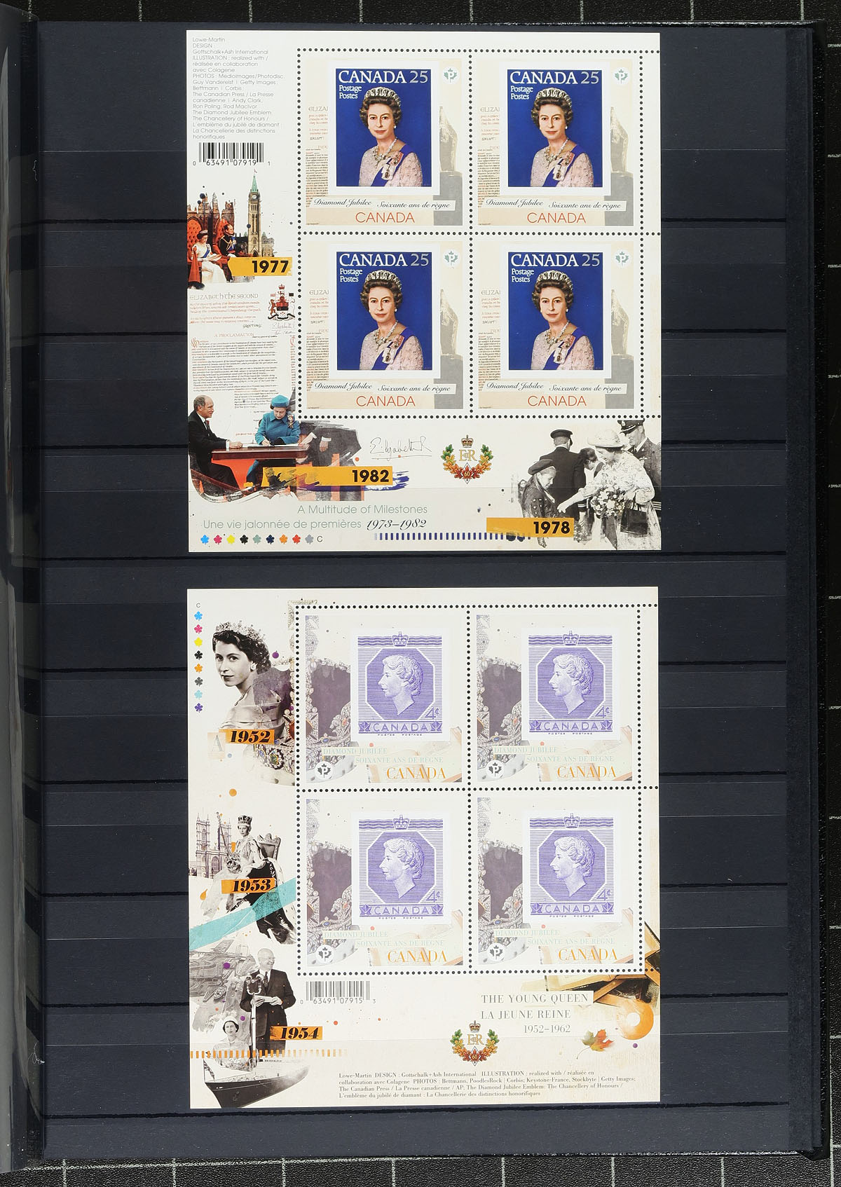 Deluxe padded 32-page Lighthouse brand stockbook, with slipcase containing an array of (mostly) mint Never Hinged Canada. An eclectic array of material here, starting with a showing of QV / QEII Jubilee issues ) the 1897 1c block is Hinged, rest never hinged. The album then transitions to 1930's to 1990's mint Canada, including Newfoundland and "back of the book" issues. A couple notable items are #604a (8c QEII imperforate pair, NH, slight bend at right, catalogue $200.00), George VI Coils, Plate Blocks, sets, Special Delivery Airmail blocks etc. A high-quality offering. Face value of the "modern" stamps alone is $200.00! Estimate =