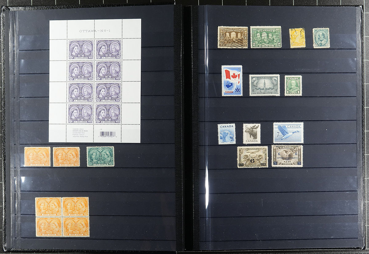 Deluxe padded 32-page Lighthouse brand stockbook, with slipcase containing an array of (mostly) mint Never Hinged Canada. An eclectic array of material here, starting with a showing of QV / QEII Jubilee issues ) the 1897 1c block is Hinged, rest never hinged. The album then transitions to 1930's to 1990's mint Canada, including Newfoundland and "back of the book" issues. A couple notable items are #604a (8c QEII imperforate pair, NH, slight bend at right, catalogue $200.00), George VI Coils, Plate Blocks, sets, Special Delivery Airmail blocks etc. A high-quality offering. Face value of the "modern" stamps alone is $200.00! Estimate =