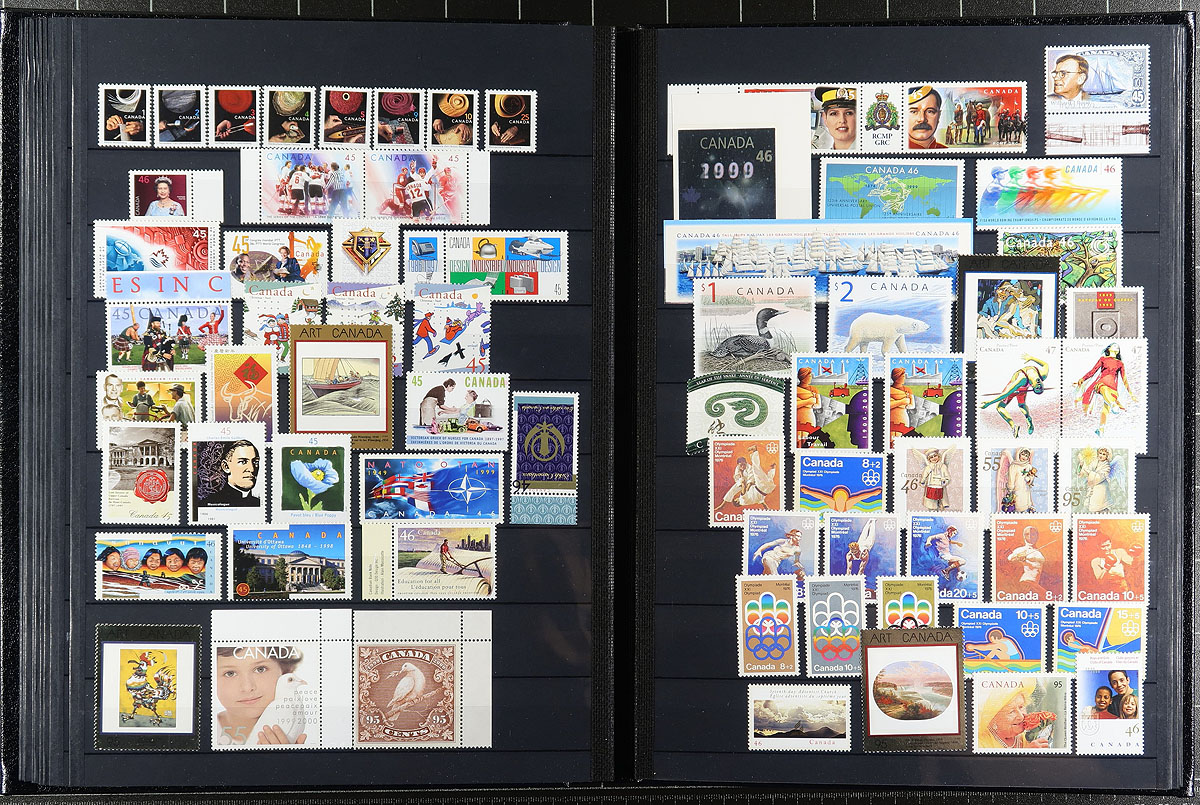 Deluxe padded 32-page Lighthouse brand stockbook, with slipcase featuring mint Never Hinged 1970's to early 2000's Canada. A "postage plus" lot, with many better items including $8.00 Grizzly / $5.00 Moose panes of 4, $1.00 White-Tailed Deer/Walrus and $2.00 Sable Island Horse/Peregrine Falcon sheets, $10.00 Whale pane of 2, CFL issues, "P" stamps and more! Conservatively valued for the total face value alone, but with some premium items and a lovely stockbook. Total face value =