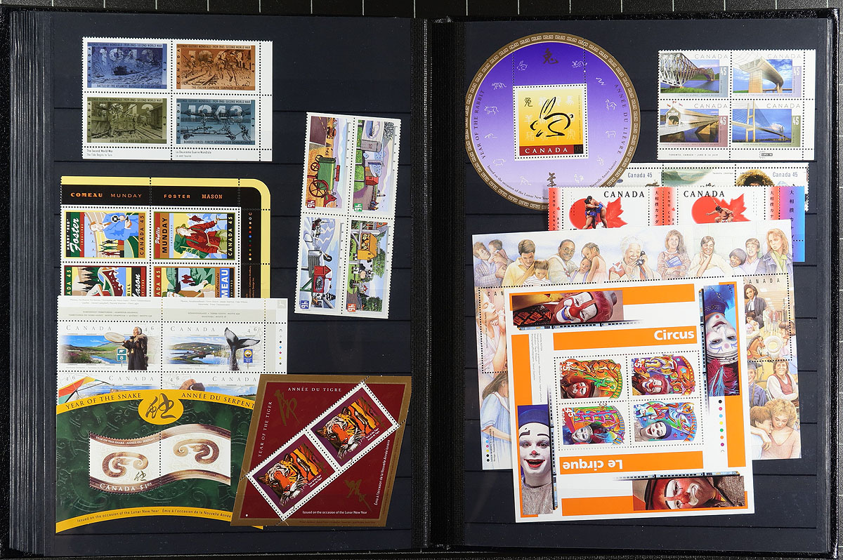 Deluxe padded 32-page Lighthouse brand stockbook, with slipcase featuring mint Never Hinged 1970's to early 2000's Canada. A "postage plus" lot, with many better items including $8.00 Grizzly / $5.00 Moose panes of 4, $1.00 White-Tailed Deer/Walrus and $2.00 Sable Island Horse/Peregrine Falcon sheets, $10.00 Whale pane of 2, CFL issues, "P" stamps and more! Conservatively valued for the total face value alone, but with some premium items and a lovely stockbook. Total face value =