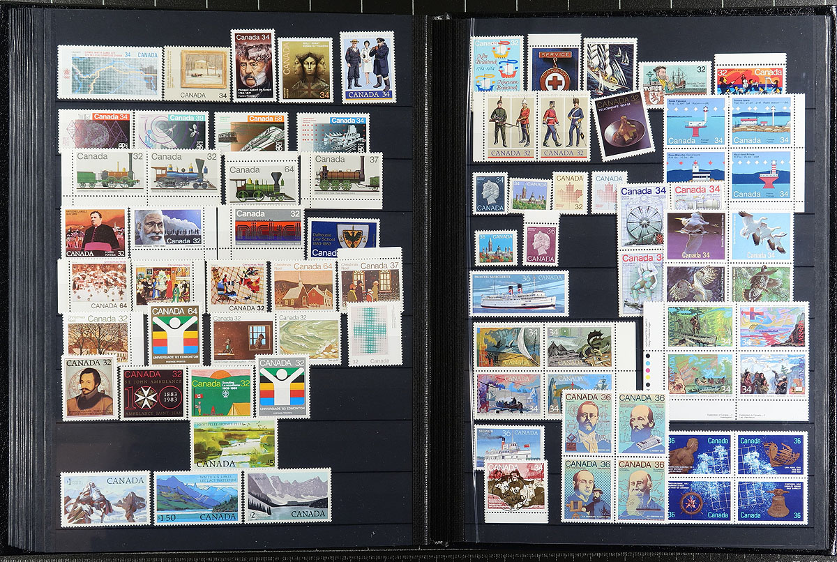 Deluxe padded 32-page Lighthouse brand stockbook, with slipcase featuring mint Never Hinged 1970's to early 2000's Canada. A "postage plus" lot, with many better items including $8.00 Grizzly / $5.00 Moose panes of 4, $1.00 White-Tailed Deer/Walrus and $2.00 Sable Island Horse/Peregrine Falcon sheets, $10.00 Whale pane of 2, CFL issues, "P" stamps and more! Conservatively valued for the total face value alone, but with some premium items and a lovely stockbook. Total face value =