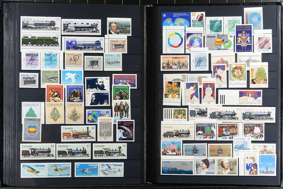 Deluxe padded 32-page Lighthouse brand stockbook, with slipcase featuring mint Never Hinged 1970's to early 2000's Canada. A "postage plus" lot, with many better items including $8.00 Grizzly / $5.00 Moose panes of 4, $1.00 White-Tailed Deer/Walrus and $2.00 Sable Island Horse/Peregrine Falcon sheets, $10.00 Whale pane of 2, CFL issues, "P" stamps and more! Conservatively valued for the total face value alone, but with some premium items and a lovely stockbook. Total face value =