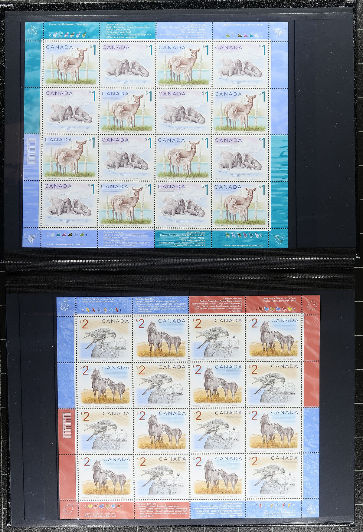 Deluxe padded 32-page Lighthouse brand stockbook, with slipcase featuring mint Never Hinged 1970's to early 2000's Canada. A "postage plus" lot, with many better items including $8.00 Grizzly / $5.00 Moose panes of 4, $1.00 White-Tailed Deer/Walrus and $2.00 Sable Island Horse/Peregrine Falcon sheets, $10.00 Whale pane of 2, CFL issues, "P" stamps and more! Conservatively valued for the total face value alone, but with some premium items and a lovely stockbook. Total face value =