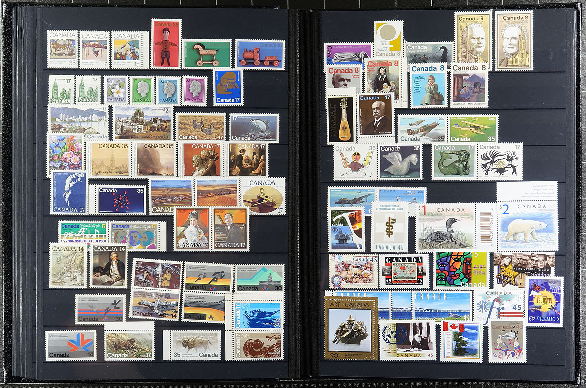 Deluxe padded 32-page Lighthouse brand stockbook, with slipcase featuring mint Never Hinged 1970's to early 2000's Canada. A "postage plus" lot, with many better items including $8.00 Grizzly / $5.00 Moose panes of 4, $1.00 White-Tailed Deer/Walrus and $2.00 Sable Island Horse/Peregrine Falcon sheets, $10.00 Whale pane of 2, CFL issues, "P" stamps and more! Conservatively valued for the total face value alone, but with some premium items and a lovely stockbook. Total face value =