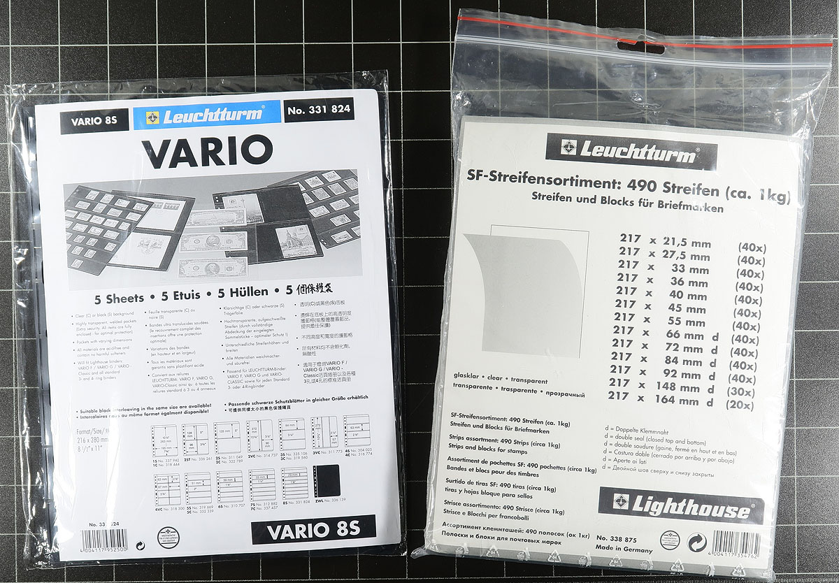 Two Lighthouse brand classic "Grande" 3-ring binders, with matching slipcases in Red, with Canada in gold / Canadian flag embossed on the spine. One is "like new" and the other is "new" (still in the original plastic wrap). Accompanied by a pack (5 sheets) of Vario brand 8-line pages and a bag of Lighthouse clear mounts. Original retail would be near $200.00. Estimate =