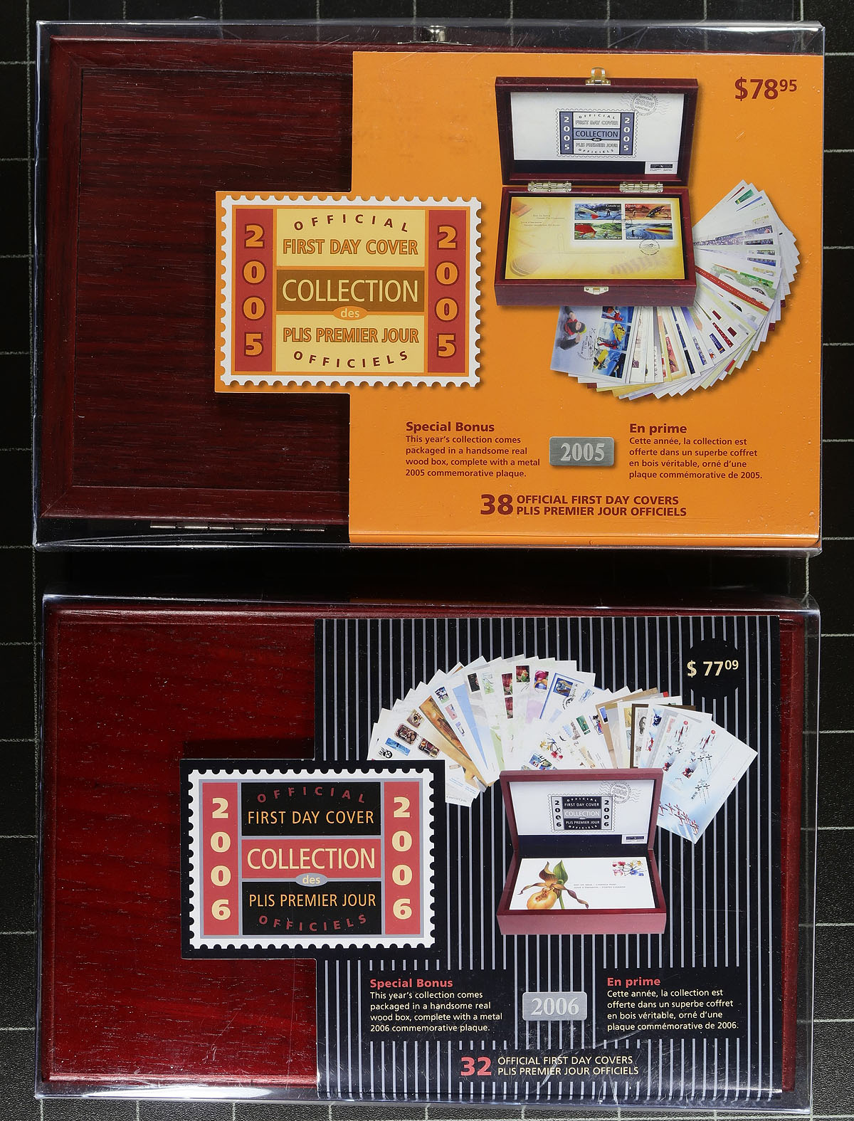 Post Office WOODEN BOXED SET First Day Covers 2005-2011 (inclusive) and then 2016 and 2023 (the latter, 2023 x 2). A pristine offering of 10 complete Post Office "Wood Box" FDC annual collections, all still in the original P.O. packaging. We rarely see these, as they sold at a hefty premium and were produced in lower quantities. Not listed in Unitrade. Total original retail price =
