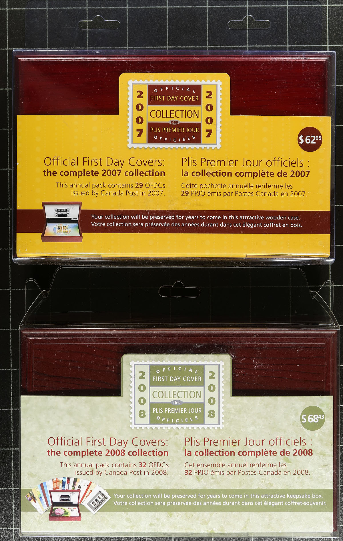 Post Office WOODEN BOXED SET First Day Covers 2005-2011 (inclusive) and then 2016 and 2023 (the latter, 2023 x 2). A pristine offering of 10 complete Post Office "Wood Box" FDC annual collections, all still in the original P.O. packaging. We rarely see these, as they sold at a hefty premium and were produced in lower quantities. Not listed in Unitrade. Total original retail price =
