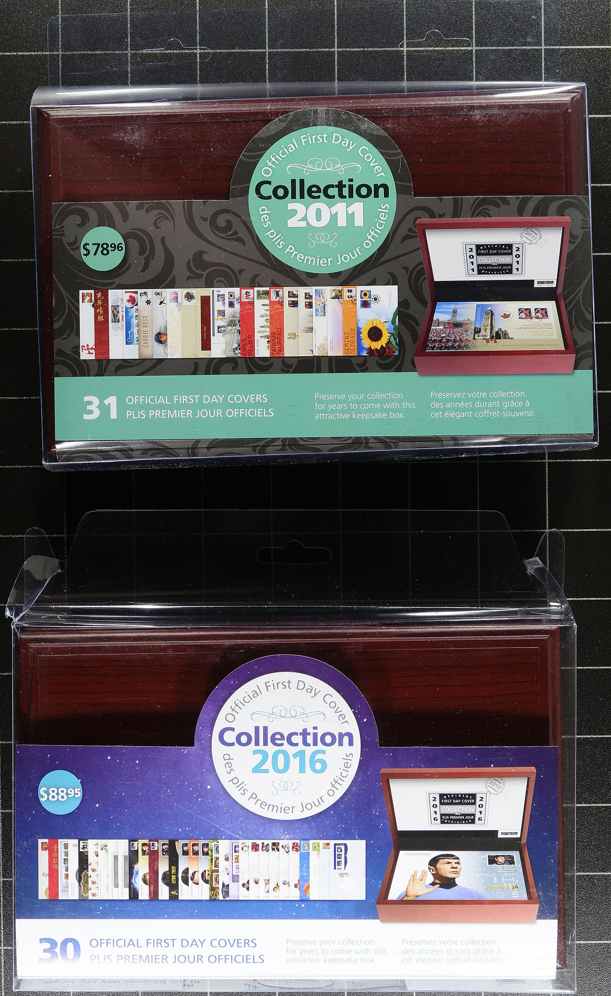 Post Office WOODEN BOXED SET First Day Covers 2005-2011 (inclusive) and then 2016 and 2023 (the latter, 2023 x 2). A pristine offering of 10 complete Post Office "Wood Box" FDC annual collections, all still in the original P.O. packaging. We rarely see these, as they sold at a hefty premium and were produced in lower quantities. Not listed in Unitrade. Total original retail price =