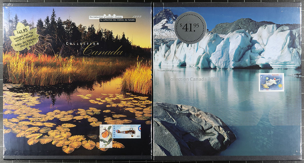 Annual Collections 1999-2007 (inclusive) plus 2016 and 2019. A choice offering of 11 different editions of Canada Post yearbooks, all in pristine condition with matching slipcases. These Canada Post publications contain the mint NH stamps, souvenir sheets and booklets for these nine years including many "P" stamps, high-values and "Die Cut" on the self-adhesive issues. A nice showing of these impressive and informative publications. Total face value of the mint NH stamps, panes and souvenir sheets in the 11 volumes is $488.49. 2024 Unitrade =