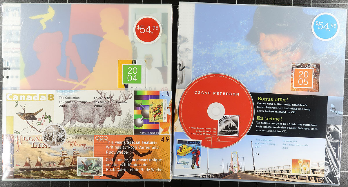 Annual Collections 1999-2007 (inclusive) plus 2016 and 2019. A choice offering of 11 different editions of Canada Post yearbooks, all in pristine condition with matching slipcases. These Canada Post publications contain the mint NH stamps, souvenir sheets and booklets for these nine years including many "P" stamps, high-values and "Die Cut" on the self-adhesive issues. A nice showing of these impressive and informative publications. Total face value of the mint NH stamps, panes and souvenir sheets in the 11 volumes is $488.49. 2024 Unitrade =
