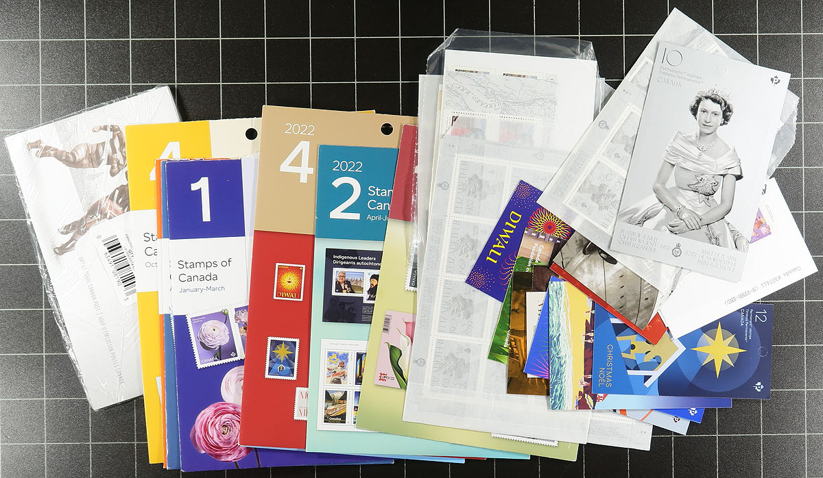 The Great Canadian (mostly modern) Catch-All. The enticing "balance" of the collection from the "immaculate" albums offered in this sale. A pizza sized box, plus a tube (Beneficial Insect un-cut press sheet) offering that includes Thematic Collections (Miss Supertest III, 2012 QEII Jubilee set plus folder, 2008 Founding of Quebec), duo-tang with "Continuity of the Crown in Canada" stockpage with stamps from QV to Charles, Flight in Canada FDC pack, $3.00 Montreal Canadiens lenticular sheet x2, 2022/2023 Quarterly Packs complete (all open, but stamps still intact), CFL 2012 Sealed FDC Set, 18 different 2022 FDC, complete modern booklets (up to King Charles) etc. Face value alone of just the usable mint stamps is over $850.00. Estimate =