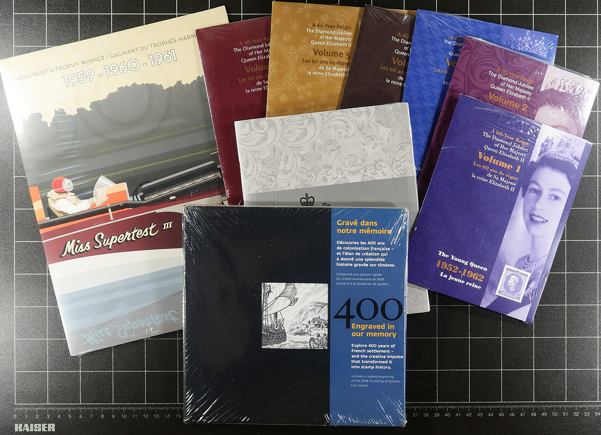 The Great Canadian (mostly modern) Catch-All. The enticing "balance" of the collection from the "immaculate" albums offered in this sale. A pizza sized box, plus a tube (Beneficial Insect un-cut press sheet) offering that includes Thematic Collections (Miss Supertest III, 2012 QEII Jubilee set plus folder, 2008 Founding of Quebec), duo-tang with "Continuity of the Crown in Canada" stockpage with stamps from QV to Charles, Flight in Canada FDC pack, $3.00 Montreal Canadiens lenticular sheet x2, 2022/2023 Quarterly Packs complete (all open, but stamps still intact), CFL 2012 Sealed FDC Set, 18 different 2022 FDC, complete modern booklets (up to King Charles) etc. Face value alone of just the usable mint stamps is over $850.00. Estimate =