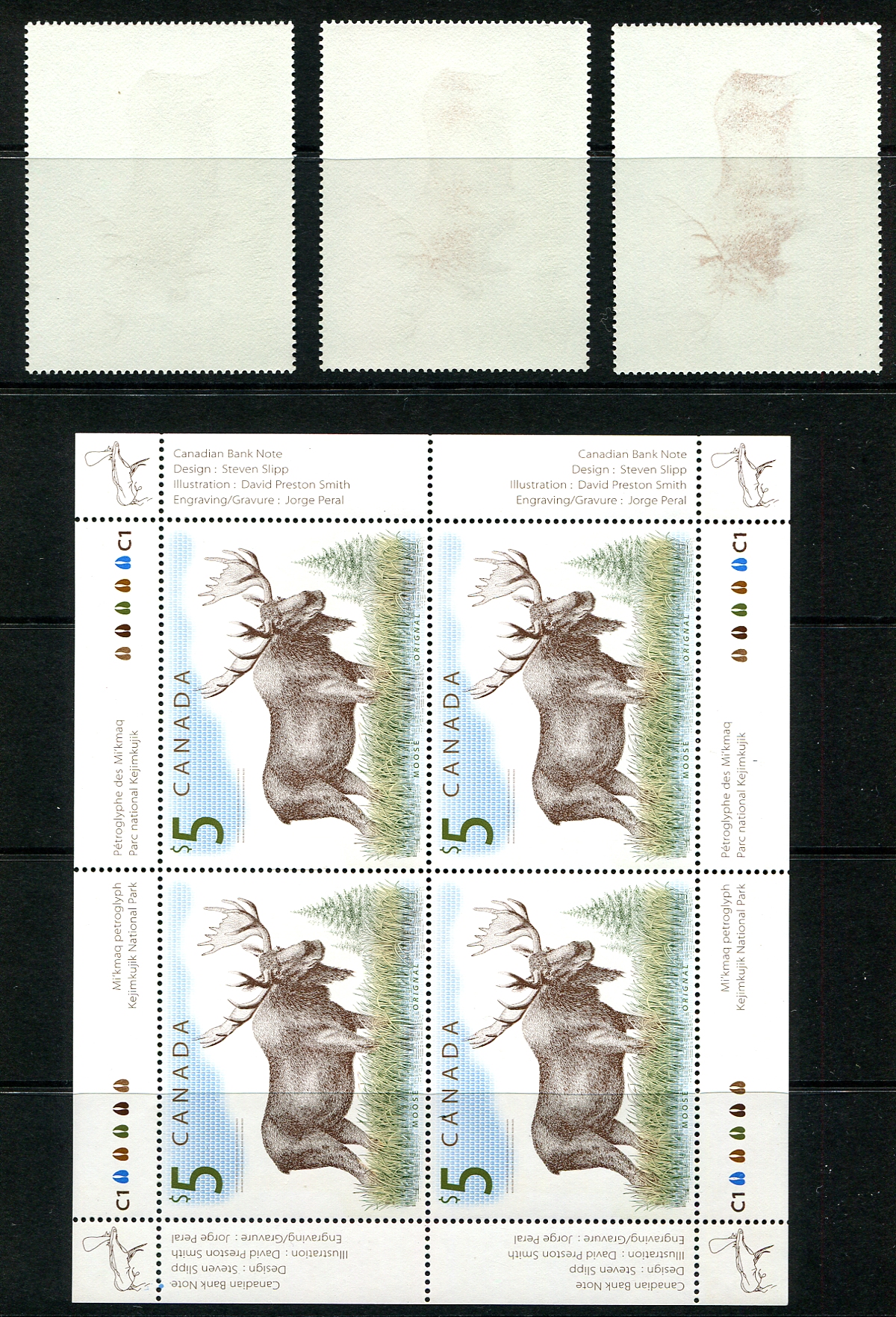 VF mint Never Hinged varieties of the 2003 issued $5.00 Moose high-value definitive. Includes a block (pane of 4) of the "strong offset on back of the brown Moose on gum side" (#1693ii, accompanied by 2019 AIEP certificate), plus three singles showing the progression of the offset (of these three, we only counted the most extreme as the variety in the catalogue value). All this is complimented by a pane of 4, showing the "vertical scratch through top pair of stamps" (#1693i). Valued as 5x 1693ii (offset), 1693i (vertical scratch top pair) and 4x regular singles. 2024 Unitrade =
