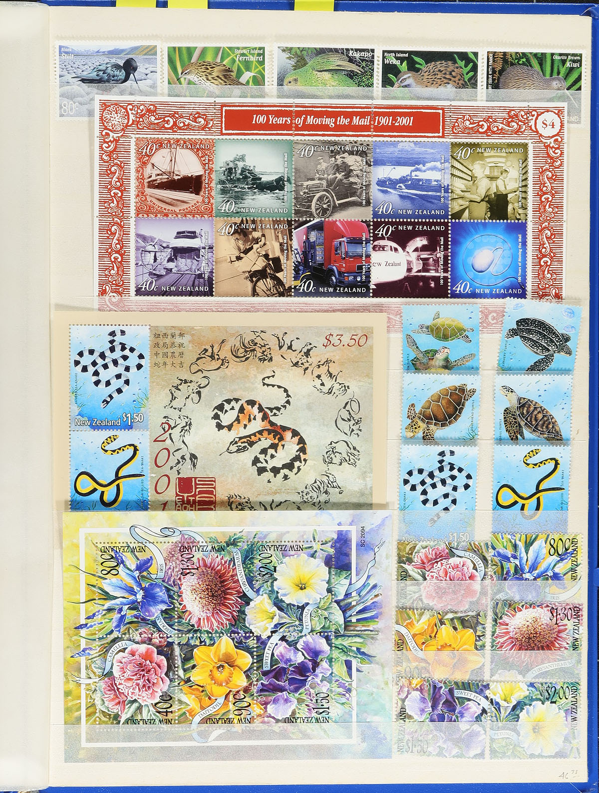 Lovely collection of mint Never Hinged New Zealand, 1969-2012, containing 950 stamps and roughly 35 souvenir sheets in a Unisafe stockbook. The collection contains Post Office purchases, neatly organized ranging from Scott #434a/2392, noting singles and sets cataloging in the $5 to $10 and up range. Face value alone totals NZ$1,029.00 ($839.60 CDN). A lovely clean collection for New Zealand and worldwide collectors. 2026 Scott US$1,369.00 =