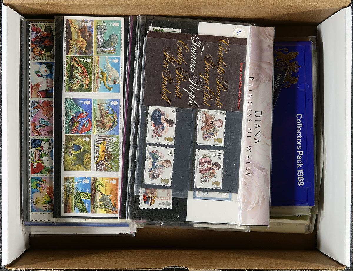 Group of roughly 100 Great Britain presentation packs, 1965-2007, in a box, with roughly 30% being pre-1971. We note some packs cataloguing in the £5 to £15 and up range. Face value alone totals £202.00 (including roughly 60x 1ST stamps). A nice clean lot for collectors and postage users alike. 2022 Stanley Gibbons Concise £560.00 in CDN dollars =