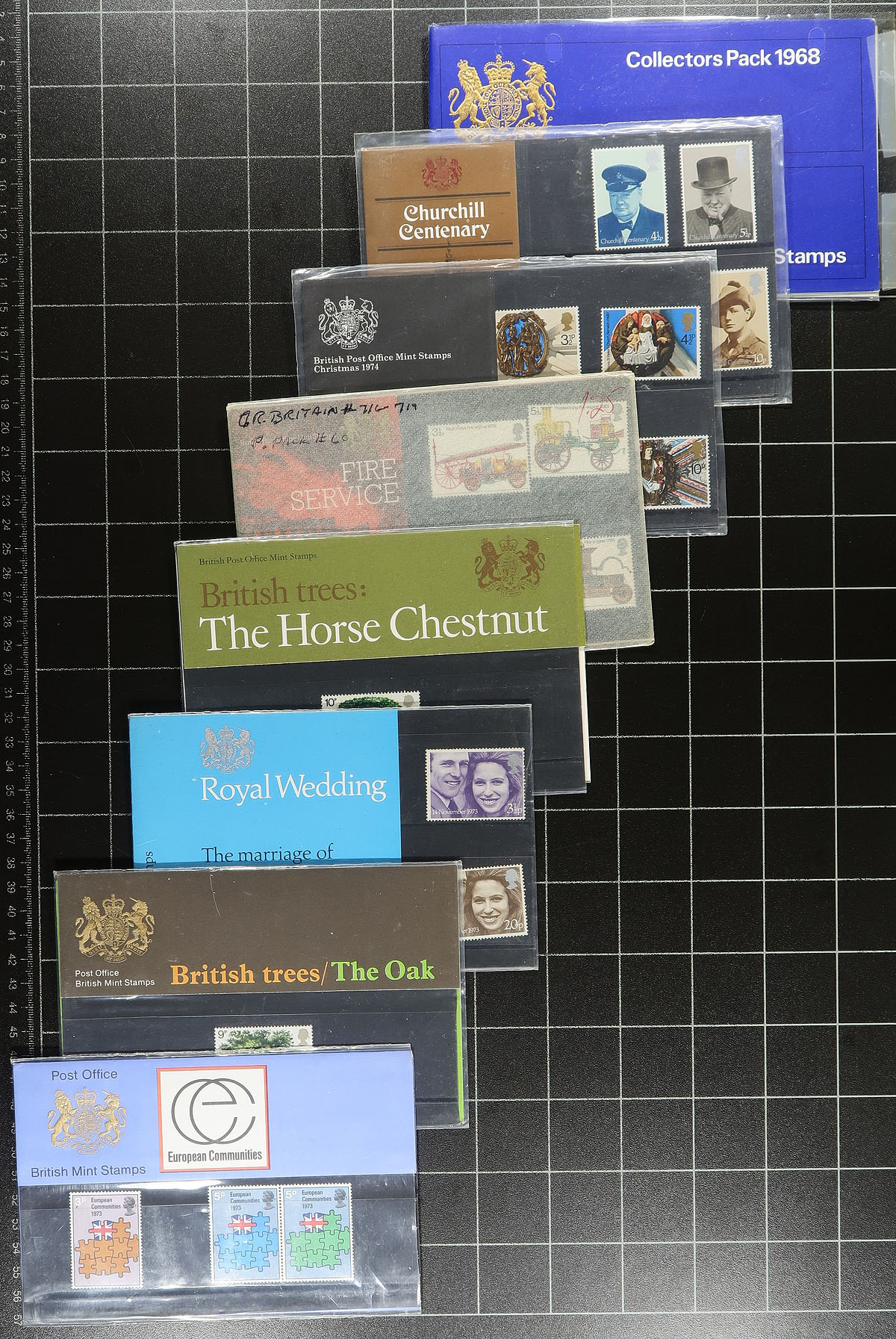 Group of roughly 100 Great Britain presentation packs, 1965-2007, in a box, with roughly 30% being pre-1971. We note some packs cataloguing in the £5 to £15 and up range. Face value alone totals £202.00 (including roughly 60x 1ST stamps). A nice clean lot for collectors and postage users alike. 2022 Stanley Gibbons Concise £560.00 in CDN dollars =