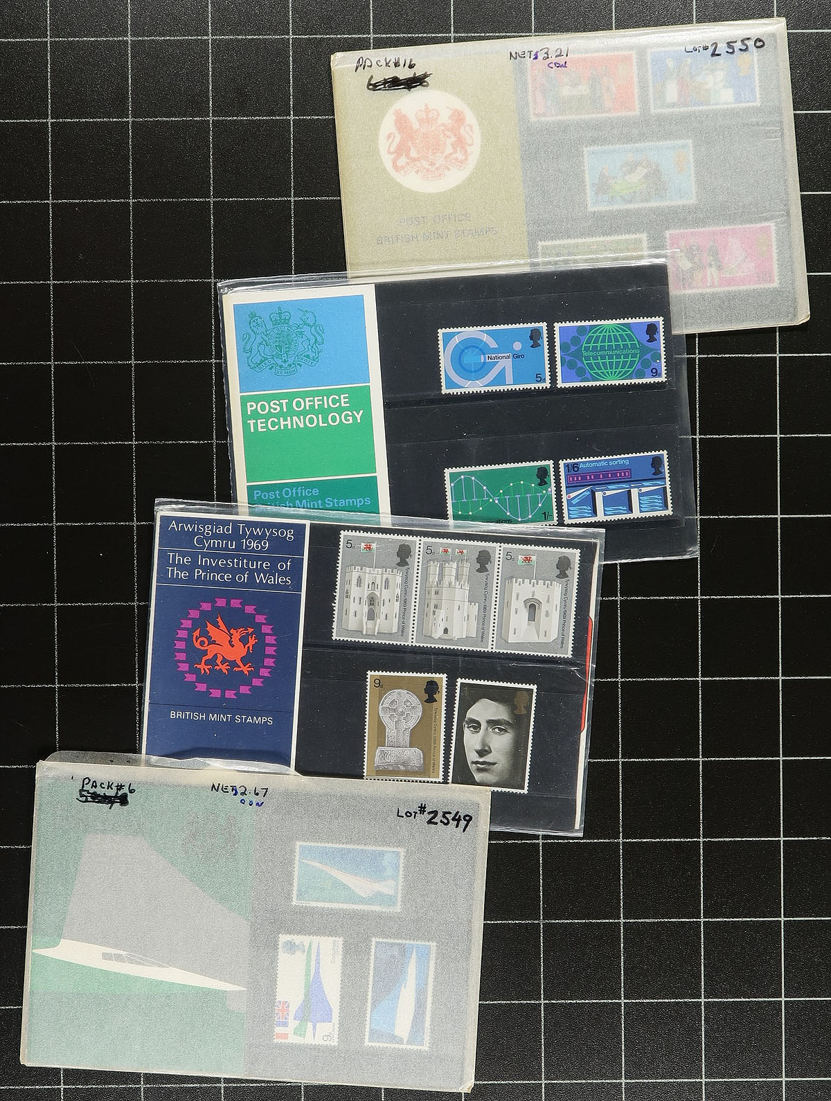 Group of roughly 100 Great Britain presentation packs, 1965-2007, in a box, with roughly 30% being pre-1971. We note some packs cataloguing in the £5 to £15 and up range. Face value alone totals £202.00 (including roughly 60x 1ST stamps). A nice clean lot for collectors and postage users alike. 2022 Stanley Gibbons Concise £560.00 in CDN dollars =