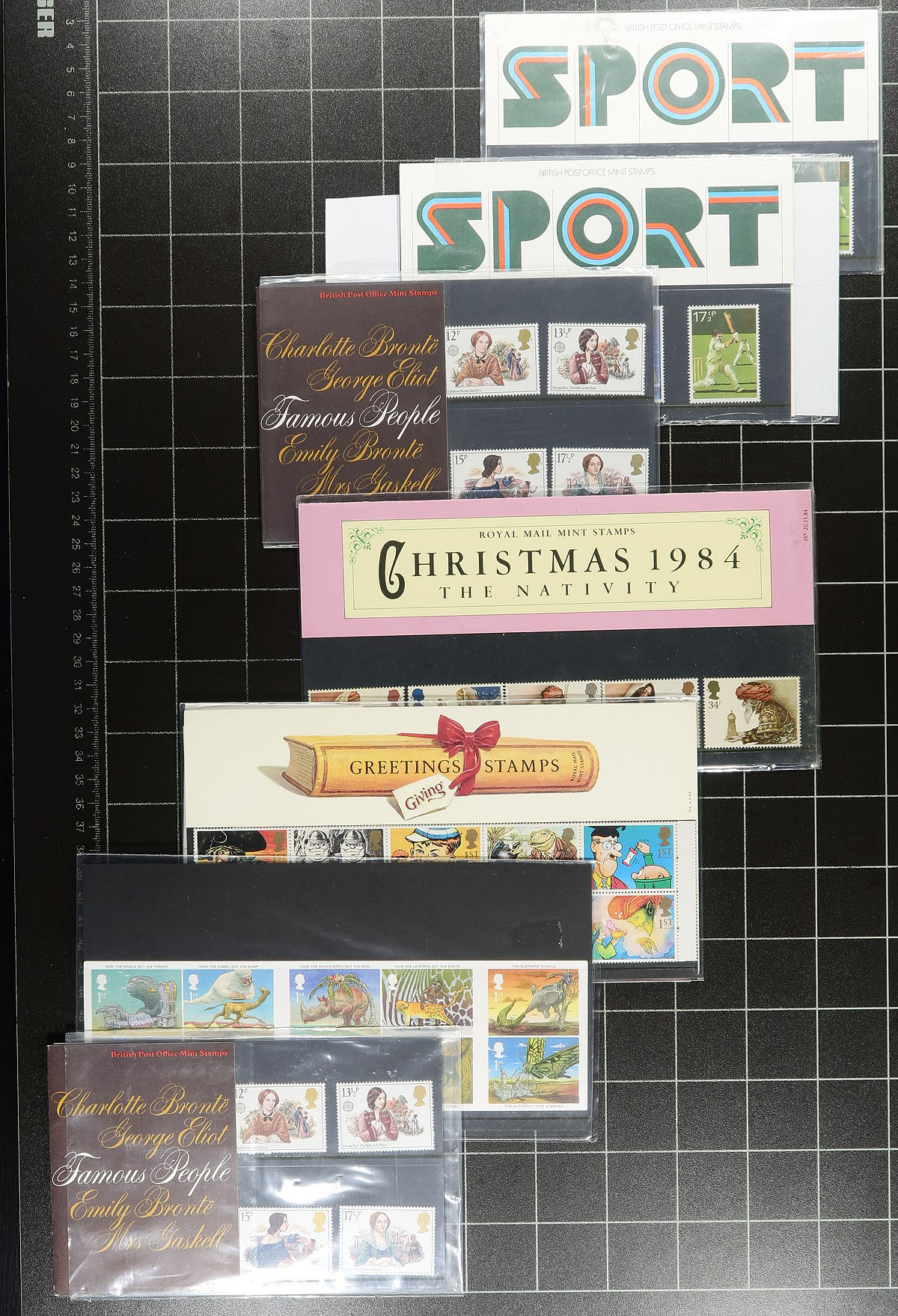 Group of roughly 100 Great Britain presentation packs, 1965-2007, in a box, with roughly 30% being pre-1971. We note some packs cataloguing in the £5 to £15 and up range. Face value alone totals £202.00 (including roughly 60x 1ST stamps). A nice clean lot for collectors and postage users alike. 2022 Stanley Gibbons Concise £560.00 in CDN dollars =