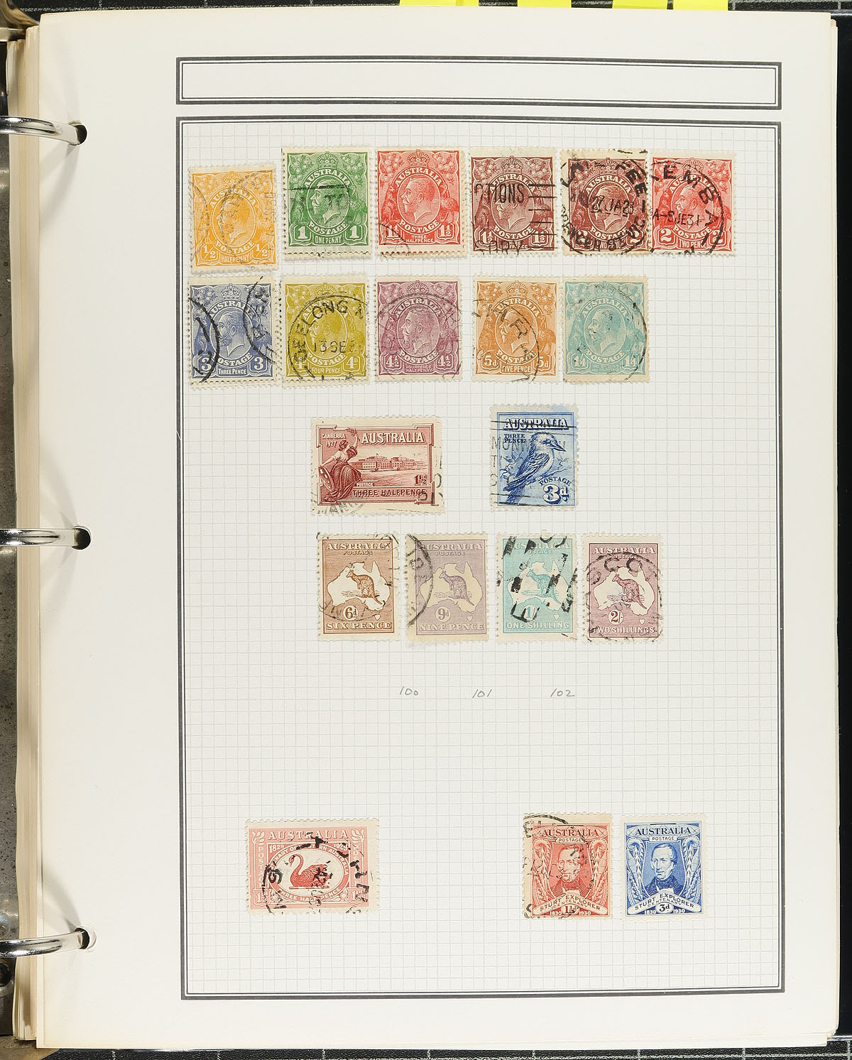 Attractive collection of used Australia, 1913-1992, containing many hundreds of stamps, neatly arranged on several quadrille pages. The collection begins with decent representation of Kangaroos and KGV heads, noting Scott #s 1-10 ($241 total), 19-37 ($127 total), 45-54 ($222 total), 66-76 ($67 total), along with some singles, sets, and partial sets cataloguing $10 to $20 and up. A nice collection that should be expanded. Estimate =