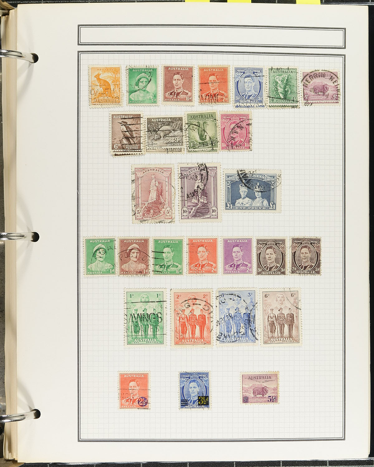 Attractive collection of used Australia, 1913-1992, containing many hundreds of stamps, neatly arranged on several quadrille pages. The collection begins with decent representation of Kangaroos and KGV heads, noting Scott #s 1-10 ($241 total), 19-37 ($127 total), 45-54 ($222 total), 66-76 ($67 total), along with some singles, sets, and partial sets cataloguing $10 to $20 and up. A nice collection that should be expanded. Estimate =