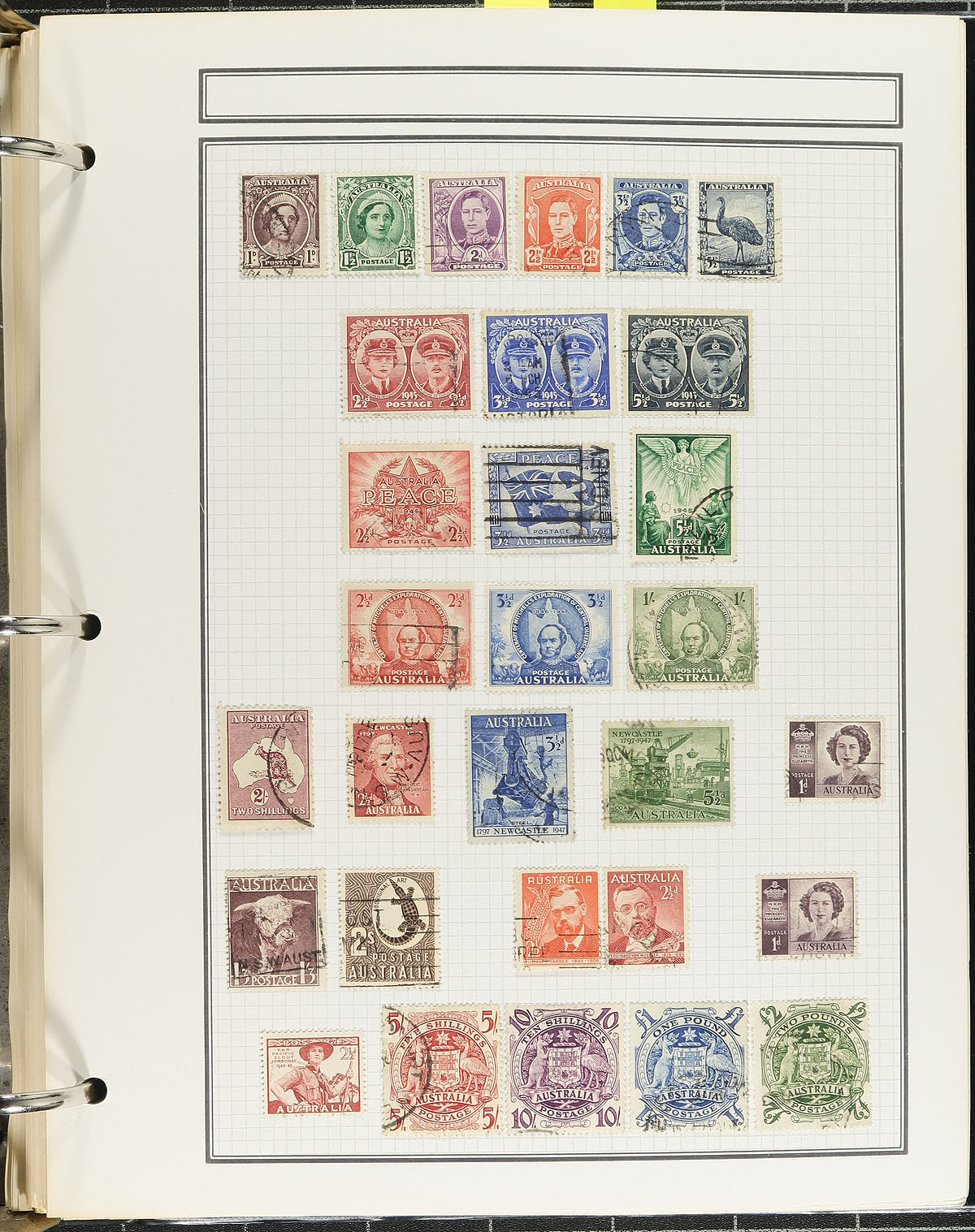Attractive collection of used Australia, 1913-1992, containing many hundreds of stamps, neatly arranged on several quadrille pages. The collection begins with decent representation of Kangaroos and KGV heads, noting Scott #s 1-10 ($241 total), 19-37 ($127 total), 45-54 ($222 total), 66-76 ($67 total), along with some singles, sets, and partial sets cataloguing $10 to $20 and up. A nice collection that should be expanded. Estimate =