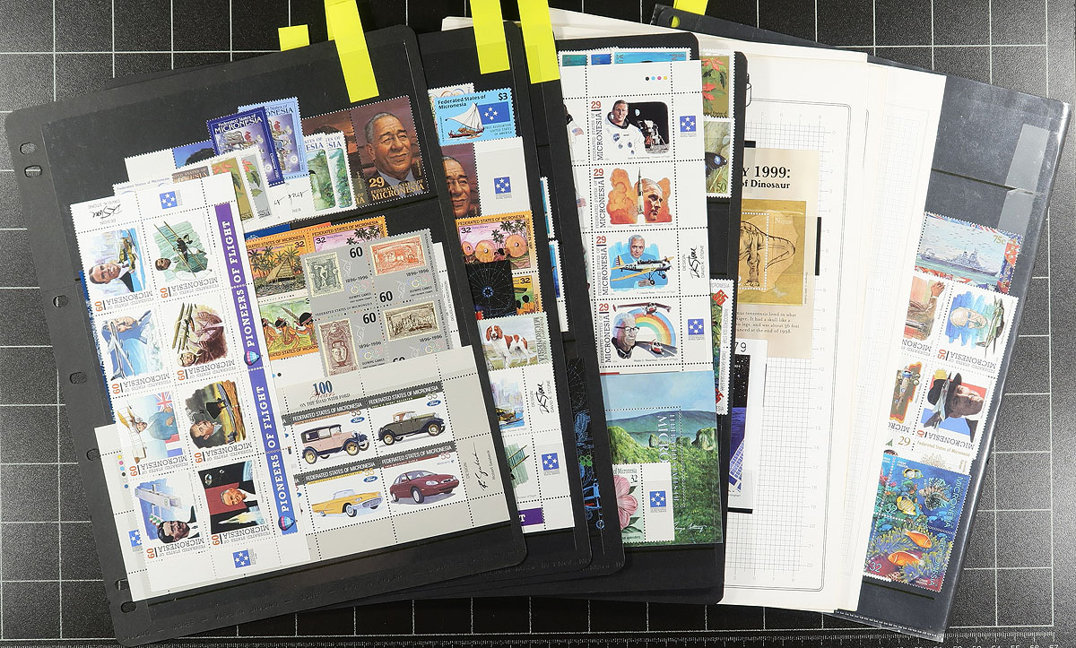 Lovely collection / accumulation of never hinged Micronesia, 1986-1999, with several hundreds of stamps, and many sheetlets, in roughly 25 stock pages. The lot contains primarily sets, blocks, and souvenir sheets and sheetlets, mostly from the 1990's, generally cataloguing from $5 to $15 each. A lovely lot for topical and thematic collectors as we note a variety of suitable subjects including space, fish, butterflies, ships, and more. Duplication can range from 2 to 3 for some issues. Visually appealing for all collectors. Owner's much older 2006 Scott US$679.00 =