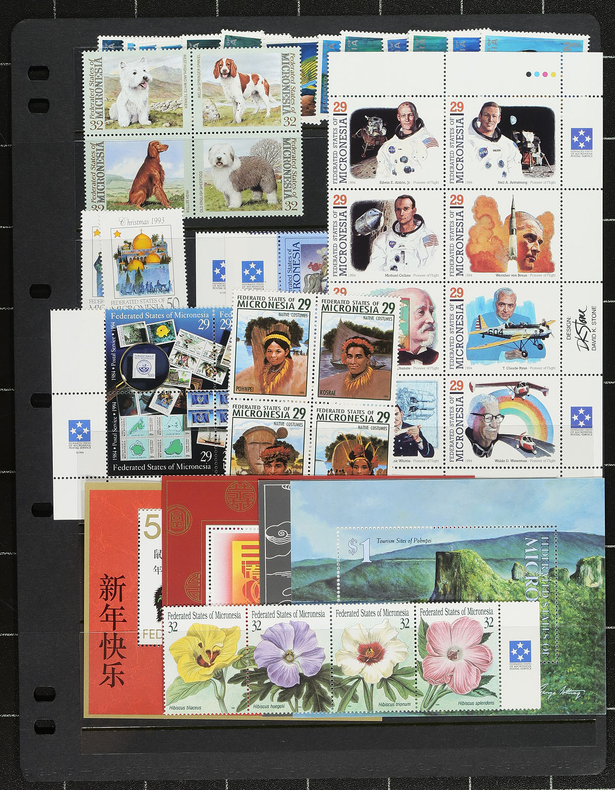 Lovely collection / accumulation of never hinged Micronesia, 1986-1999, with several hundreds of stamps, and many sheetlets, in roughly 25 stock pages. The lot contains primarily sets, blocks, and souvenir sheets and sheetlets, mostly from the 1990's, generally cataloguing from $5 to $15 each. A lovely lot for topical and thematic collectors as we note a variety of suitable subjects including space, fish, butterflies, ships, and more. Duplication can range from 2 to 3 for some issues. Visually appealing for all collectors. Owner's much older 2006 Scott US$679.00 =