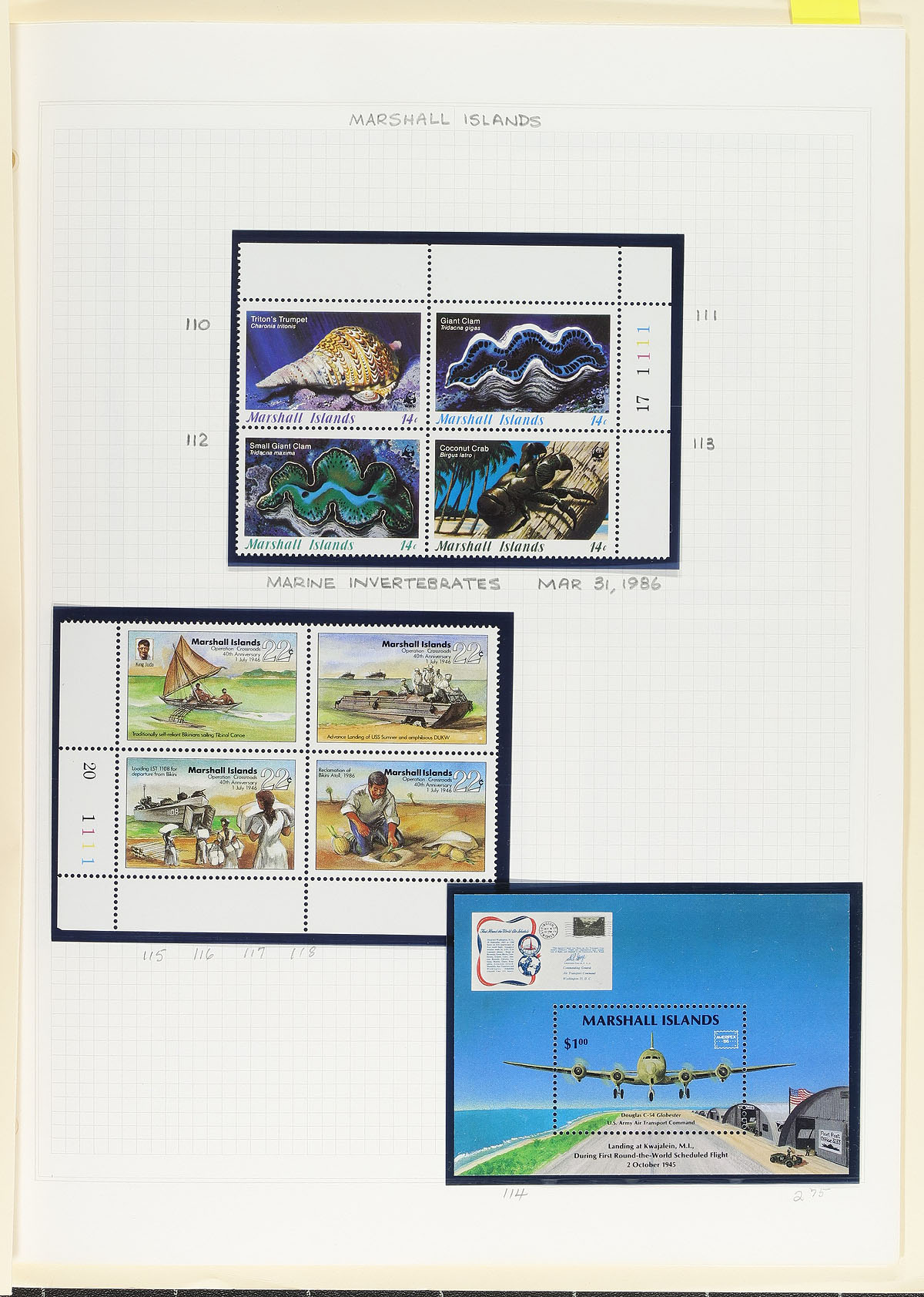 Clean group of never hinged Marshall Islands, 1986-2001, with a few hundred singles, blocks and sheets, on several album pages. The lot covers Scott #s 145a/163, 758/790, with strength in the complete sheets from 2001, many cataloguing $10 to $20 and up each. A nice lot for thematic and topical collectors as well, noting several subjects, and many visually attractive issues. Owner's older Scott (unknown year) US$388.00 =