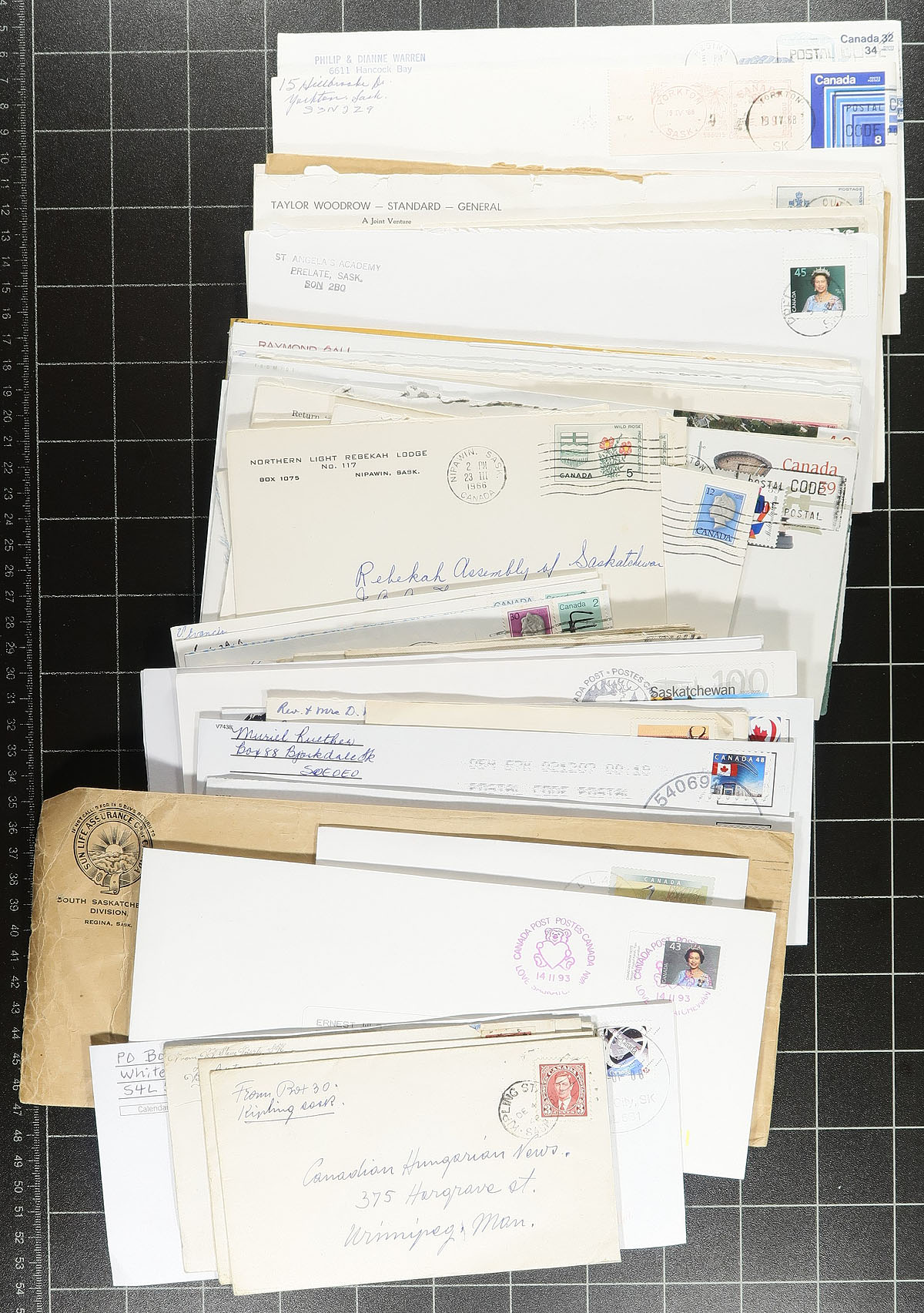 Saskatchewan Postal History. Group of roughly 400 covers collected for Saskatchewan town postmarks, 1930's-1990's, from towns ranging from A to Y primarily from the 1960's to the 1980's. The covers are all commercial in nature, including many #10 envelopes, with at least a few hundred towns represented including: Leader (Rural Municipality of Happyland), Lucky Lake, Colonsay, Wolseley, Lemsford, Foam Lake, Yellow Creek, Saskatchewan Landing, Kipling Station, and much more. Postmarks include cds, duplex, MOON, POCON, Klussendorf, split ring, Pictorials, and more. Mild duplication for a few towns, which may have different postmark types or frankings, along with some having corner advertising. Condition is mixed for a few covers, as is the nature of commercial mail. Still a nice lot for the postmark hunter. Estimate =