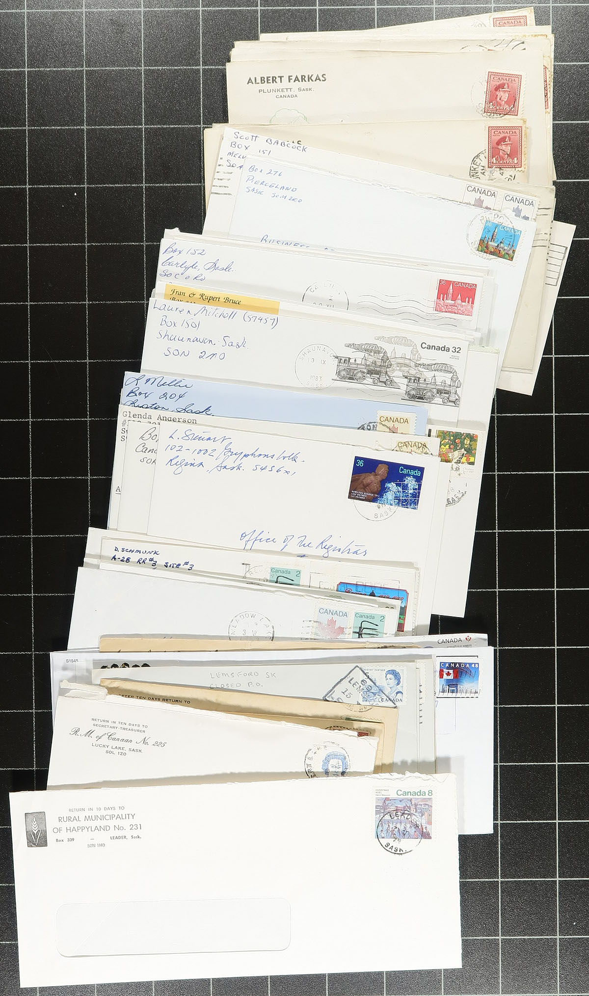 Saskatchewan Postal History. Group of roughly 400 covers collected for Saskatchewan town postmarks, 1930's-1990's, from towns ranging from A to Y primarily from the 1960's to the 1980's. The covers are all commercial in nature, including many #10 envelopes, with at least a few hundred towns represented including: Leader (Rural Municipality of Happyland), Lucky Lake, Colonsay, Wolseley, Lemsford, Foam Lake, Yellow Creek, Saskatchewan Landing, Kipling Station, and much more. Postmarks include cds, duplex, MOON, POCON, Klussendorf, split ring, Pictorials, and more. Mild duplication for a few towns, which may have different postmark types or frankings, along with some having corner advertising. Condition is mixed for a few covers, as is the nature of commercial mail. Still a nice lot for the postmark hunter. Estimate =