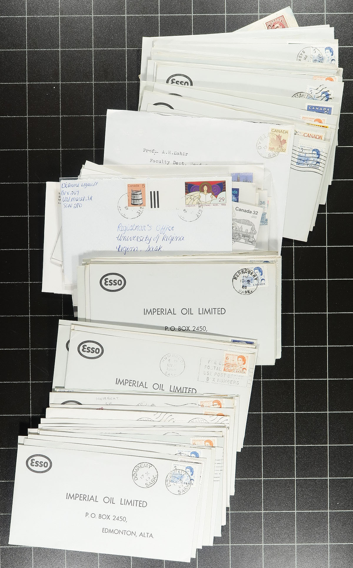 Saskatchewan Postal History. Group of roughly 400 covers collected for Saskatchewan town postmarks, 1930's-1990's, from towns ranging from A to Y primarily from the 1960's to the 1980's. The covers are all commercial in nature, including many #10 envelopes, with at least a few hundred towns represented including: Leader (Rural Municipality of Happyland), Lucky Lake, Colonsay, Wolseley, Lemsford, Foam Lake, Yellow Creek, Saskatchewan Landing, Kipling Station, and much more. Postmarks include cds, duplex, MOON, POCON, Klussendorf, split ring, Pictorials, and more. Mild duplication for a few towns, which may have different postmark types or frankings, along with some having corner advertising. Condition is mixed for a few covers, as is the nature of commercial mail. Still a nice lot for the postmark hunter. Estimate =