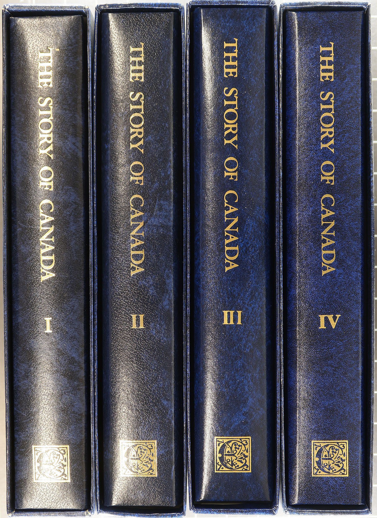 The Story of Canada Collection. The complete four volume collection of 83 different deluxe gold cacheted First Day covers making up "The Story of Canada" Excelsior Collector's Guild set. Each FDC is on a special page and includes a mint Canadian stamp (different from the stamp on FDC) that ties into the story of the FDC. An attractive, informative and hugely expensive early 1980's production (original issue cost of this lot was probably well over $800.00). Estimate =