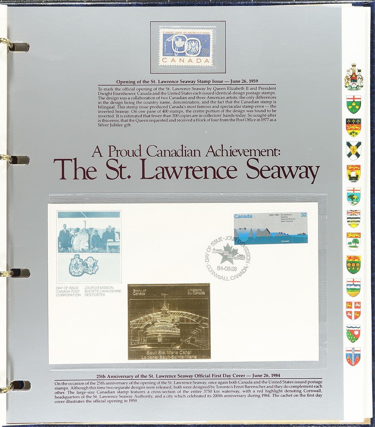 The Story of Canada Collection. The complete four volume collection of 83 different deluxe gold cacheted First Day covers making up "The Story of Canada" Excelsior Collector's Guild set. Each FDC is on a special page and includes a mint Canadian stamp (different from the stamp on FDC) that ties into the story of the FDC. An attractive, informative and hugely expensive early 1980's production (original issue cost of this lot was probably well over $800.00). Estimate =