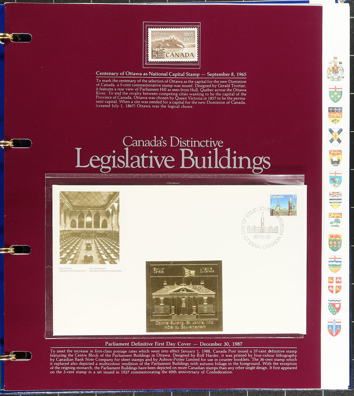 The Story of Canada Collection. The complete four volume collection of 83 different deluxe gold cacheted First Day covers making up "The Story of Canada" Excelsior Collector's Guild set. Each FDC is on a special page and includes a mint Canadian stamp (different from the stamp on FDC) that ties into the story of the FDC. An attractive, informative and hugely expensive early 1980's production (original issue cost of this lot was probably well over $800.00). Estimate =