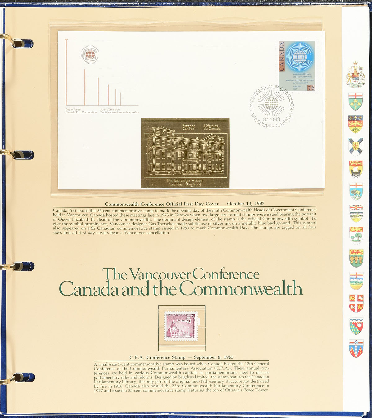 The Story of Canada Collection. The complete four volume collection of 83 different deluxe gold cacheted First Day covers making up "The Story of Canada" Excelsior Collector's Guild set. Each FDC is on a special page and includes a mint Canadian stamp (different from the stamp on FDC) that ties into the story of the FDC. An attractive, informative and hugely expensive early 1980's production (original issue cost of this lot was probably well over $800.00). Estimate =