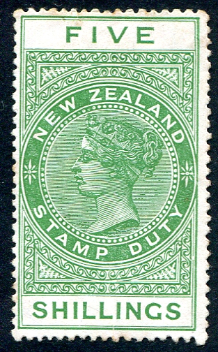 Mint Hinged / Hinge remnant example of the 1906 issued 5sh green, watermark 61, QV Postal Fiscal. Some minor gum stains (seen at top mostly), as often found on these issues. 2025 Scott US$225.00 =